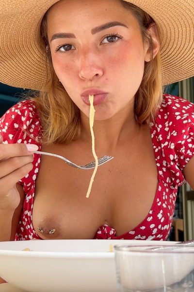 Agatha Vega hates wearing a bra so it's nice to see her having lunch with her boobs out on Braless Forever for the set Red Dress.