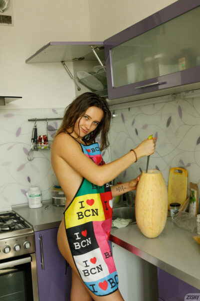 Alevtina Batman does a fruitful finale in just an apron while she ends up flashing her bare ass and pussy on Zishy.