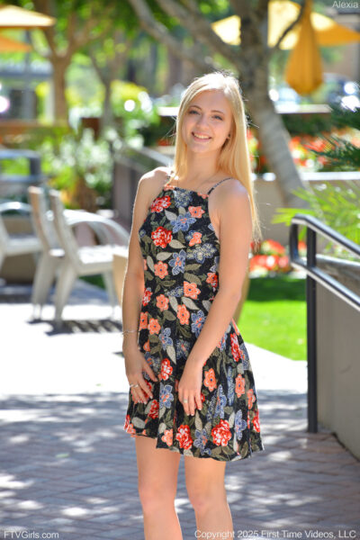 Alexia (aka Alex Grey) is having some fun in the sun with her sundress and high heels, proving she's not wearing any panties on FTV Girls.
