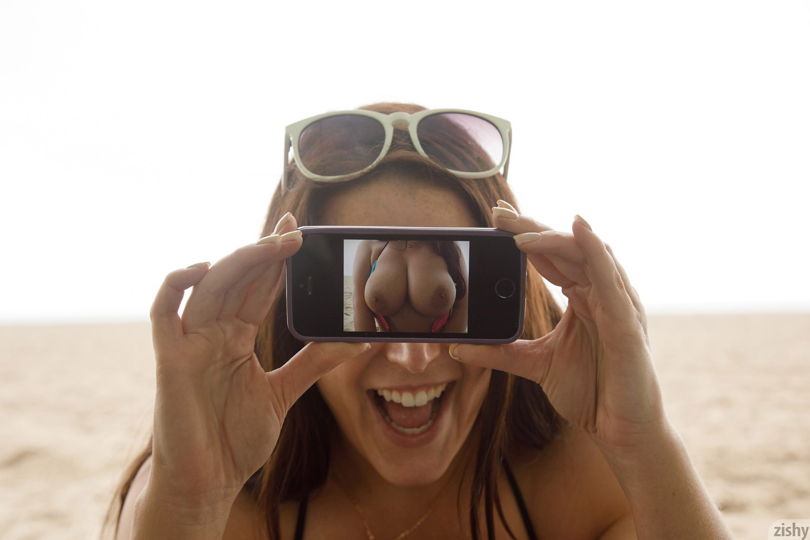 Are you ready to enjoy a nice day on the beach? Angela White pitches a tent and starts taking off her bikini top before you can even blink. I love how Zishy captures her fun loving attitude from measuring her boobs to taking sexy selfies.