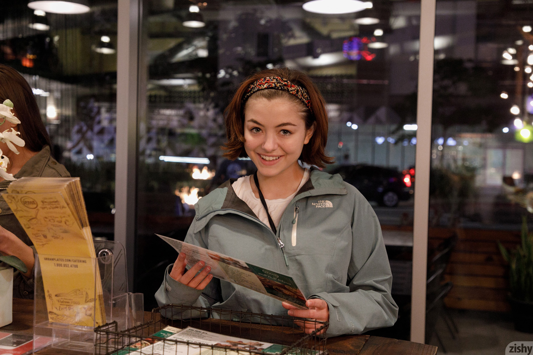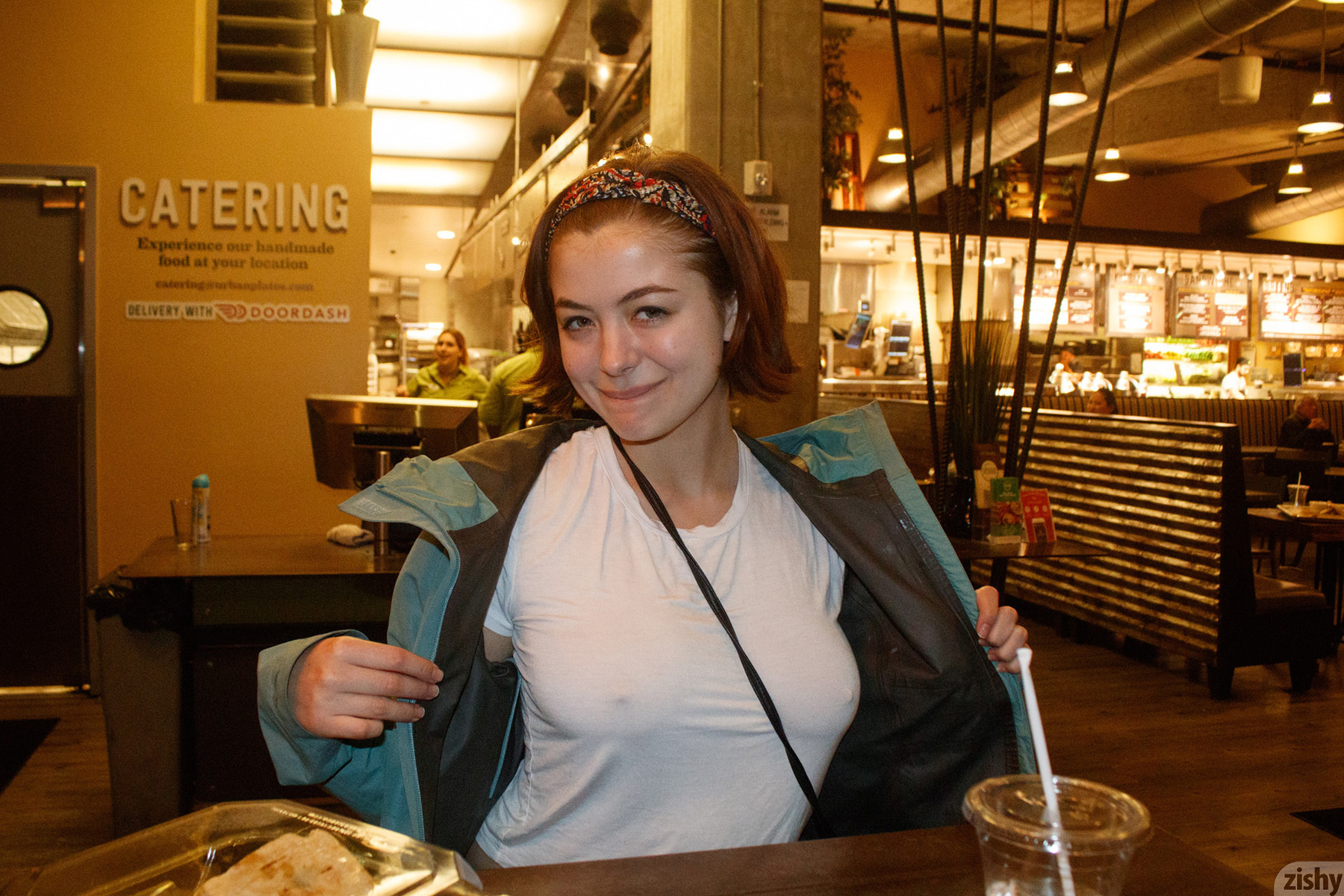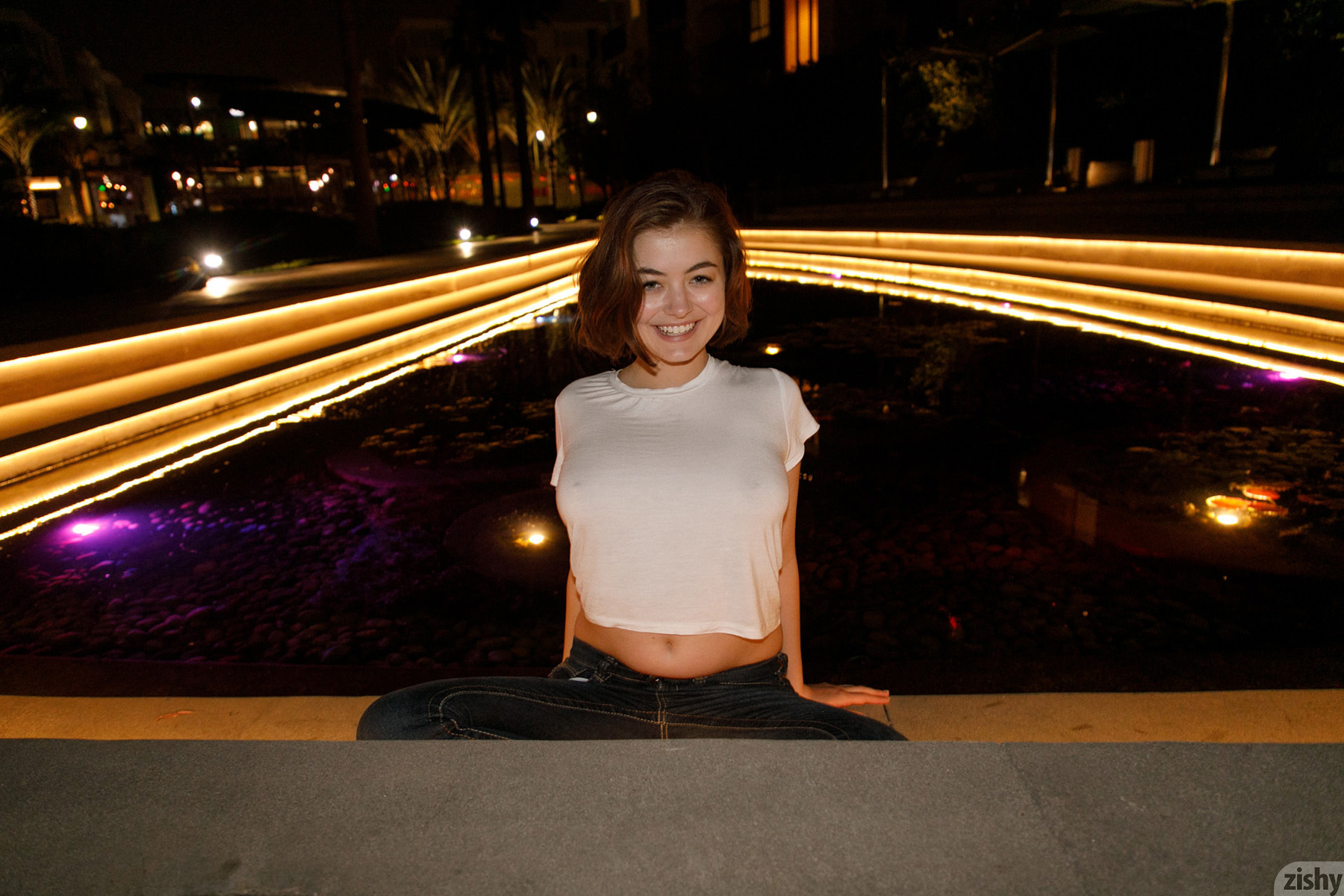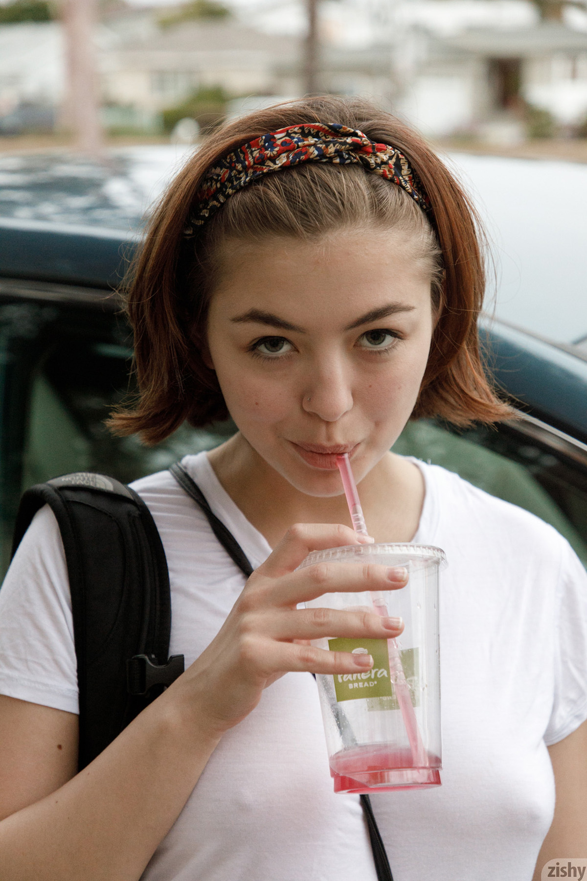 Aria Sky is sipping on her drink just pondering about how some honeybees are from space and her tits are out of this world on Zishy.