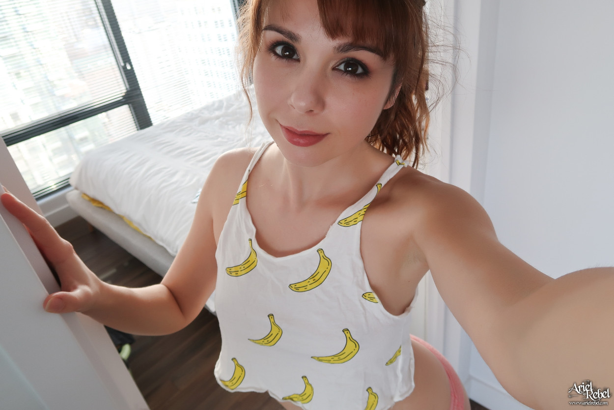 Bananas and butt, bananas and butt, Ariel Rebel is totally a butt slut. It's true, today she takes some candid selfies and she ends up sucking on a toy, coming to orgasm twice! Hi! Im Ariel. Im a regular girl from Quebec, Canada whos just trying to have fun in her life! Im an exibitionist of nature and I love to try new things! 3 years ago, I discovered modeling and I fell in love! I like to know what your mind is thinking about when youre looking at my naughty photos... I really hope you will enjoy the tease... See you inside?