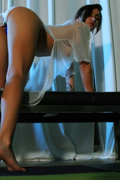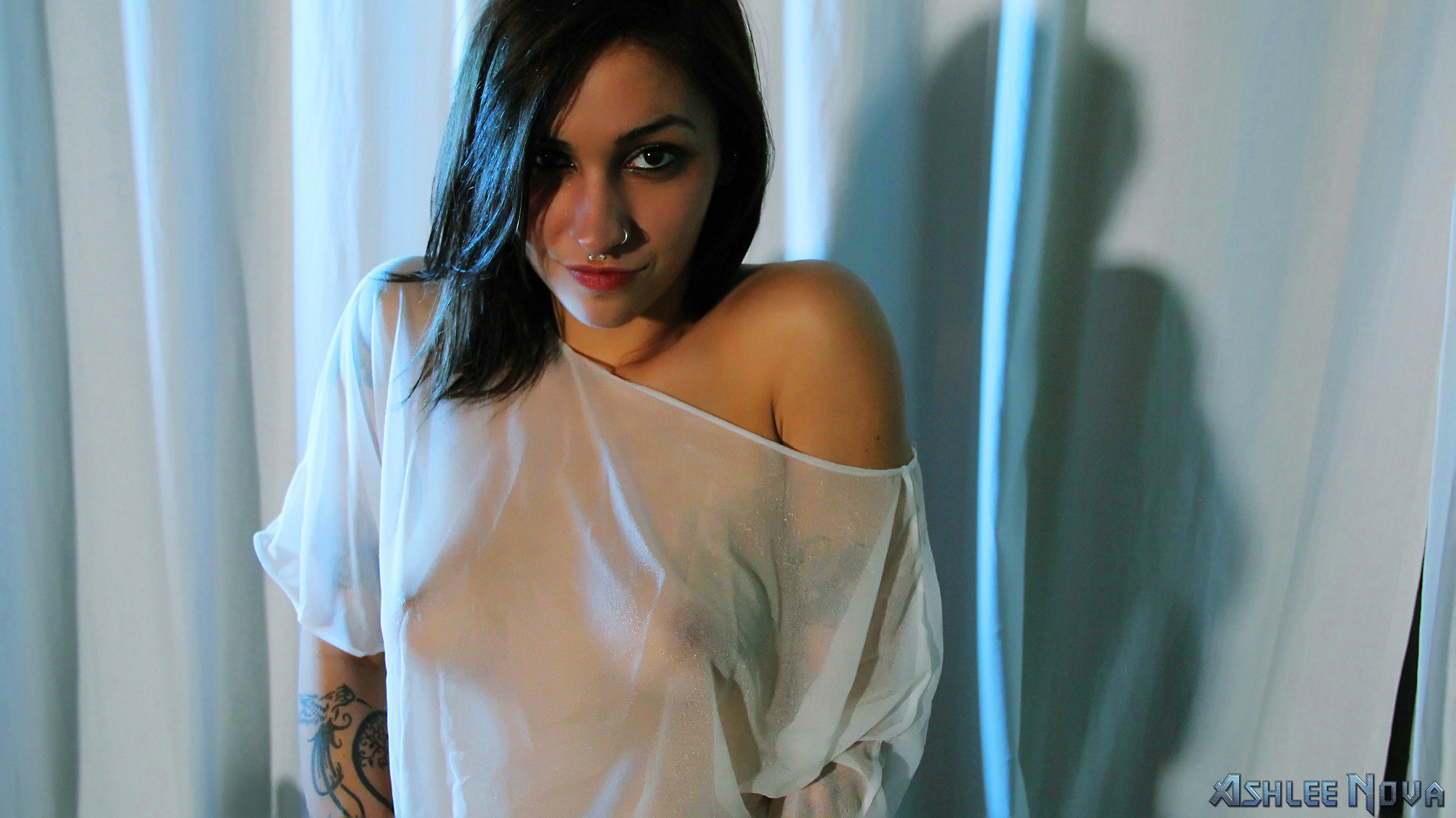 is an ethereal seductress in a see thru top and blue thong. Does it get any better than that? Yea actually, no bottoms at all, and Ashlee is definitely freshly shaved for you.