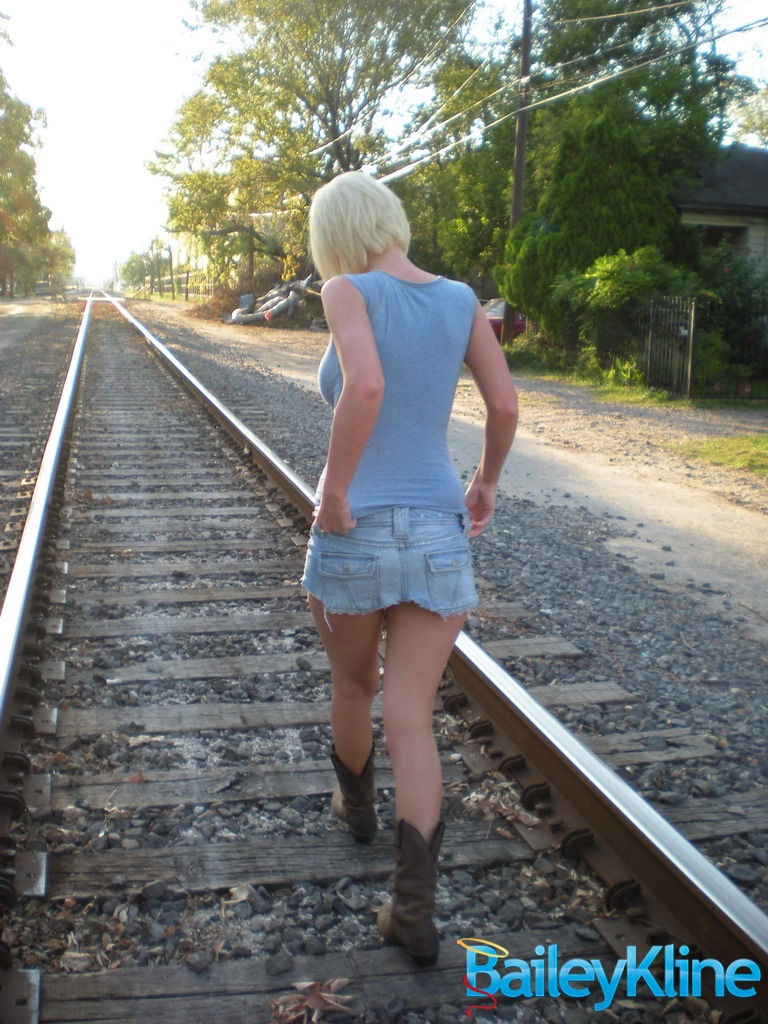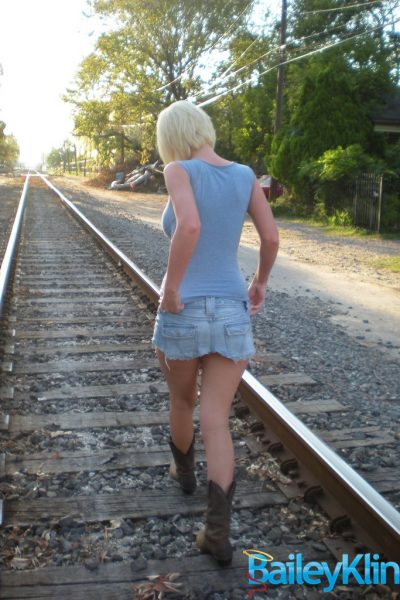 Bailey Kline teaches us that it's ok to walk on train tracks if there is a naked and busty girl by your side. That never happens to me so maybe Bailey can help me out next time? I would love to walk with a pair of big boobs in my hands lol!