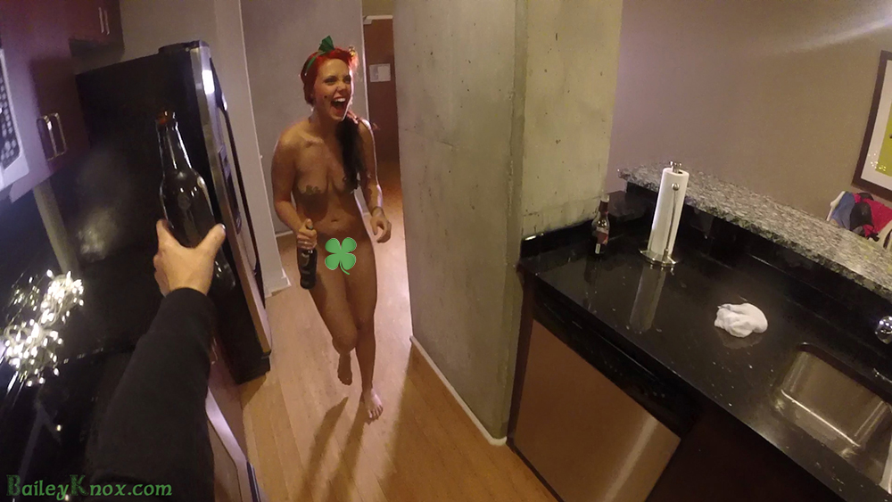Bailey Knox celebrates St. Pattys Day by walking around the kitchen in nothing but her panties, and even then, that is too much clothing. So after some time bouncing her boobs around, she slides down her panties and starts having fun with her smoothly shaven pussy. This is a girl who knows how to celebrate.
