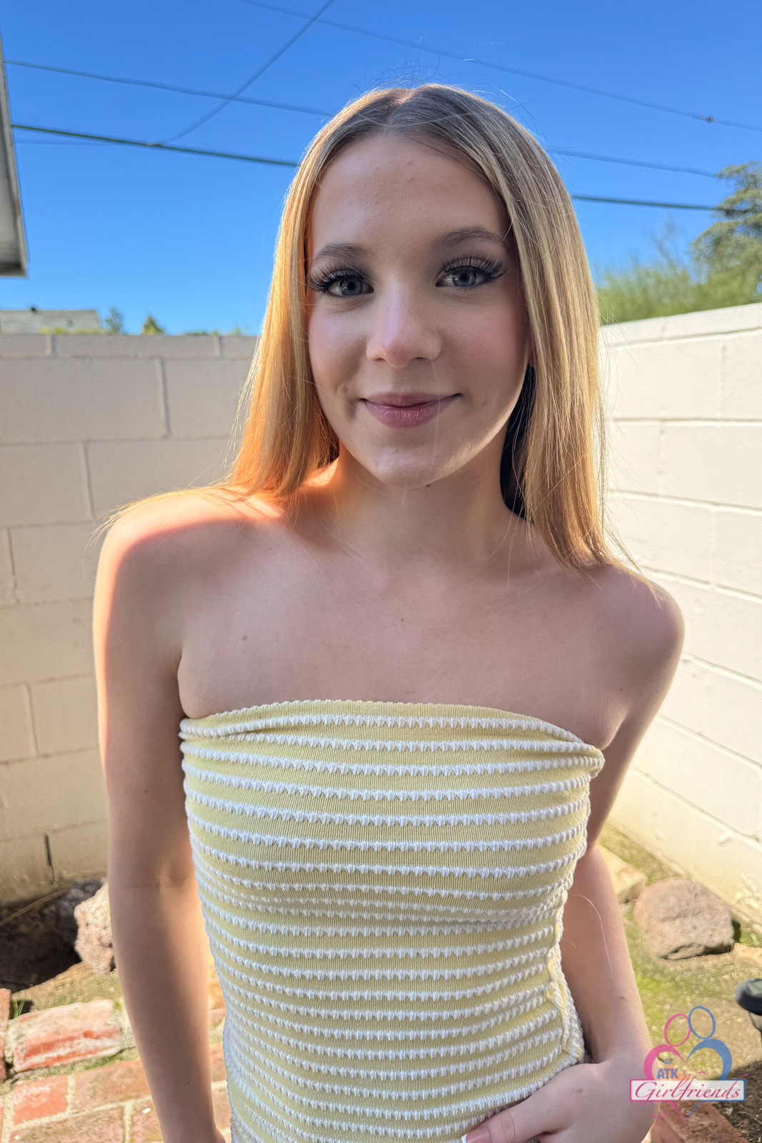 Becky Summer is that cute blonde girl next door in the mini dress and she's very excited to flash her perfect pussy lips on ATK Girlfriends.
