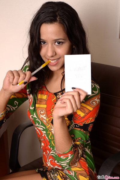 . She's peppy, she's fun, and she's not wearing any panties. Suddenly this office gig seems way better when you get a good look at Bella's shaved office pussy.