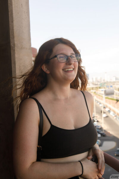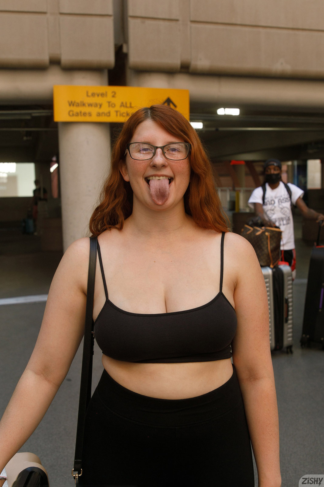 Having a romance with Bess Burton looks fun because she pulls down her tank top and leggings in public to flash her naked body on Zishy.