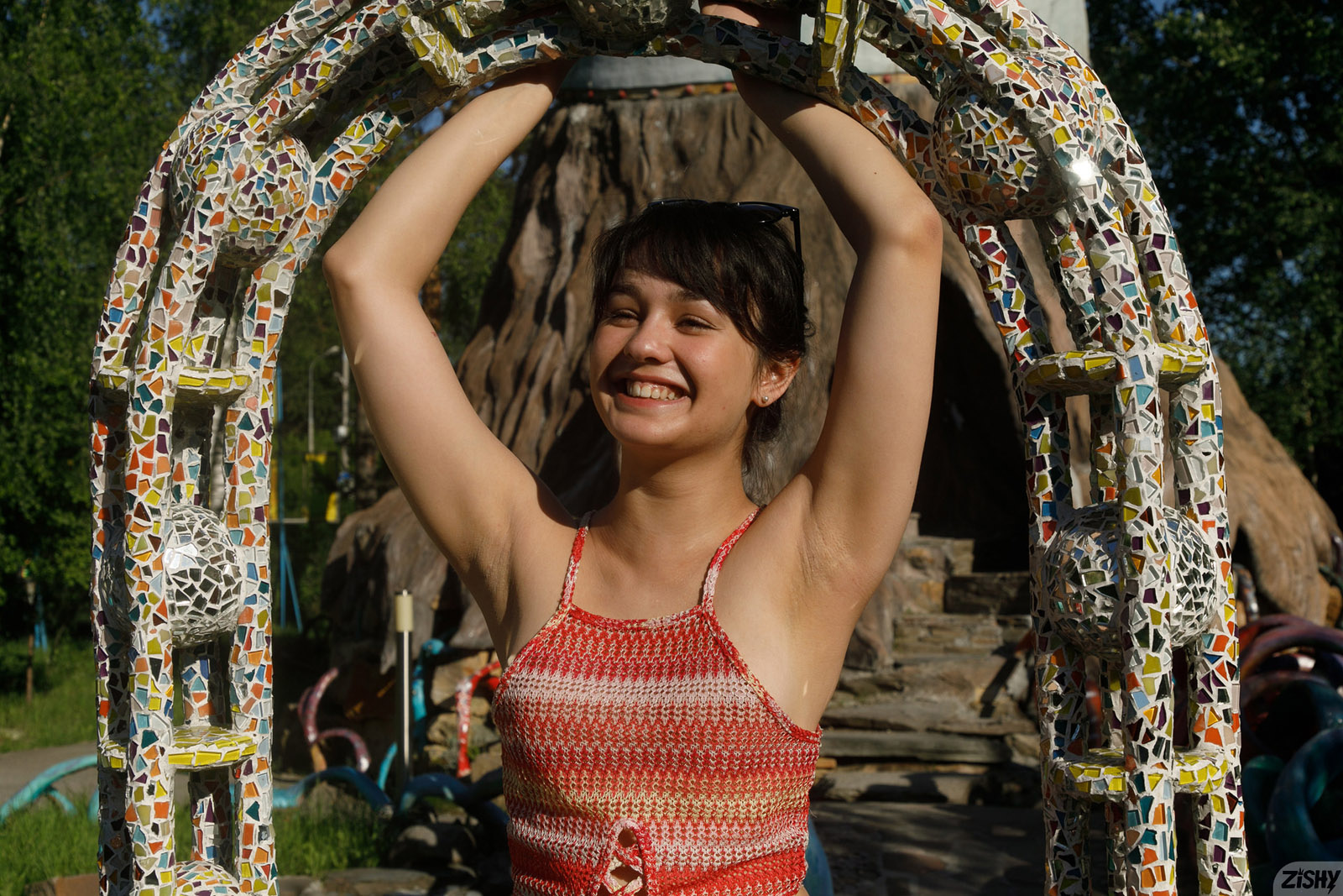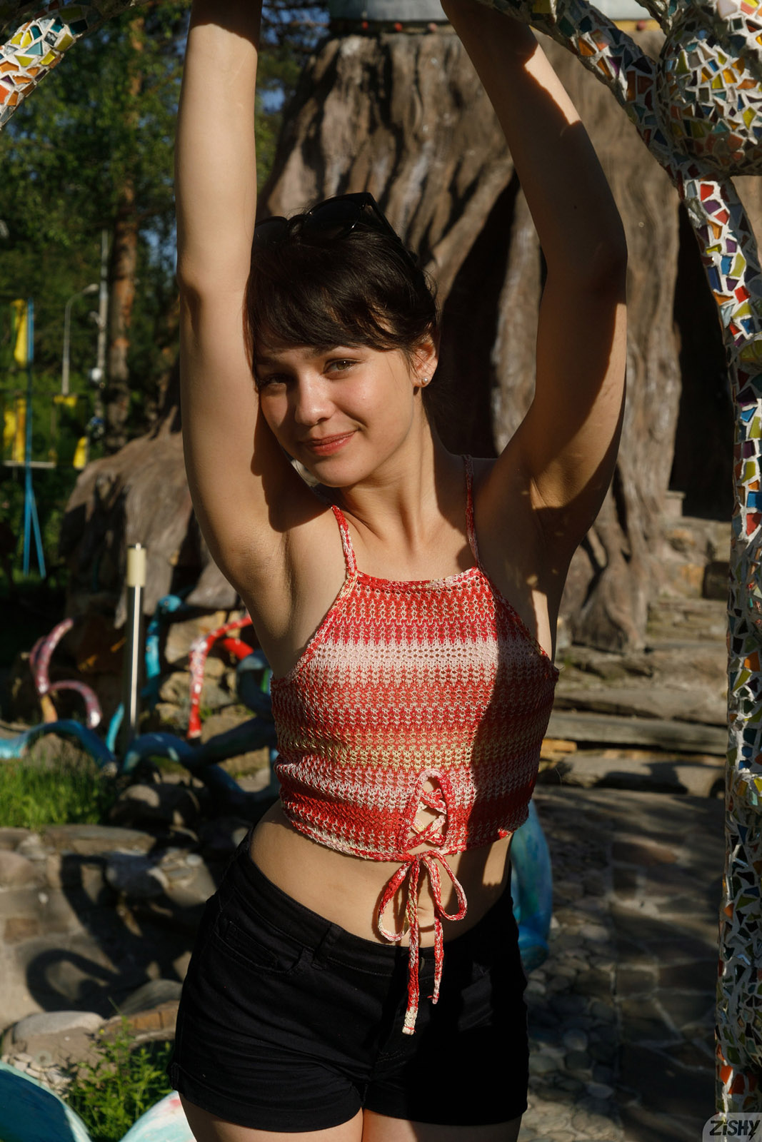 Bessi Niurba visits the museum of bullshit and has fun pulling down her shorts to flash her red thong on Zishy.