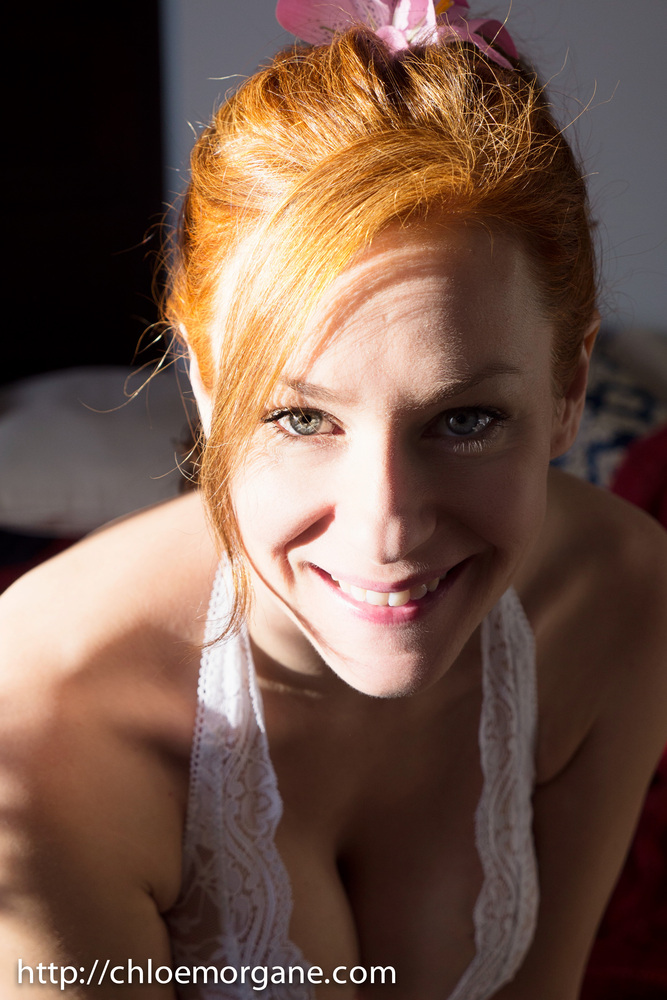 Chloe Morgane looks incredibly sexy in white lace lingerie as she gets down on the ground to be the best sexy redhead next door.