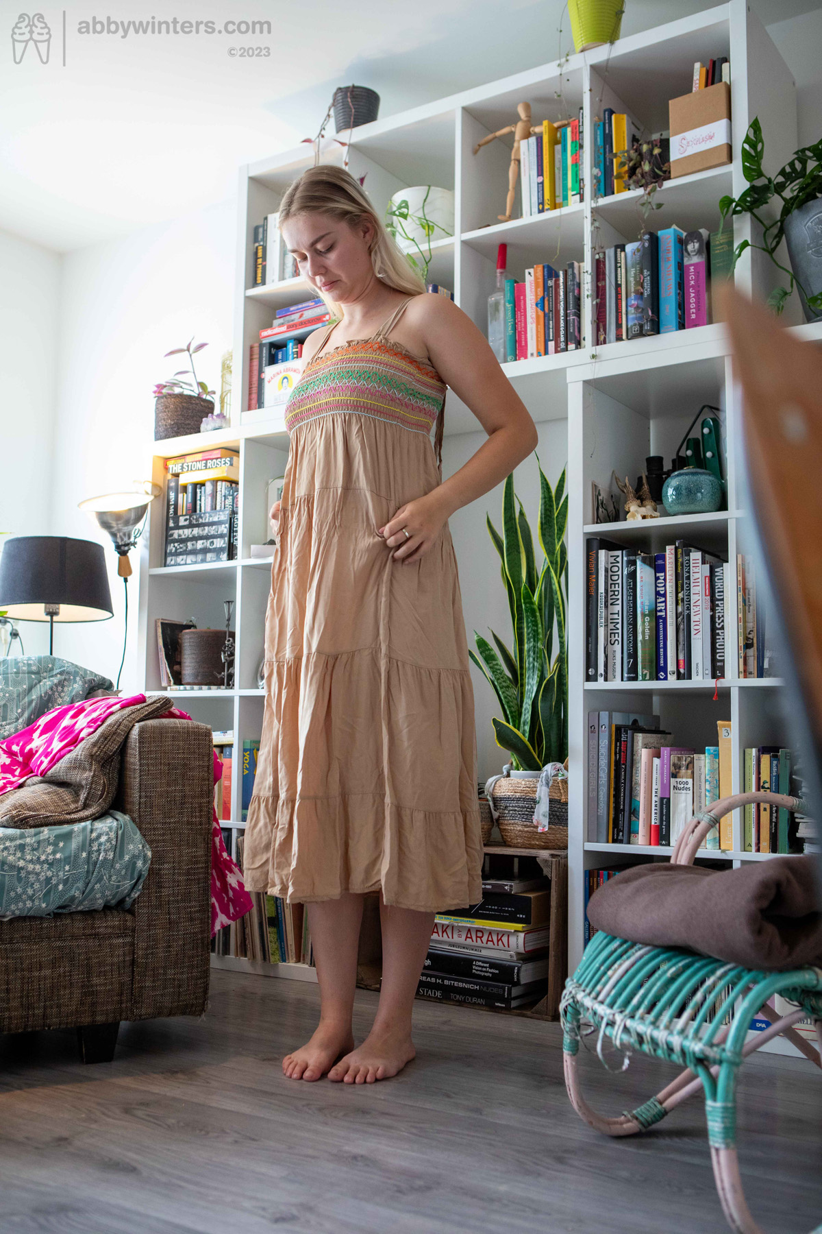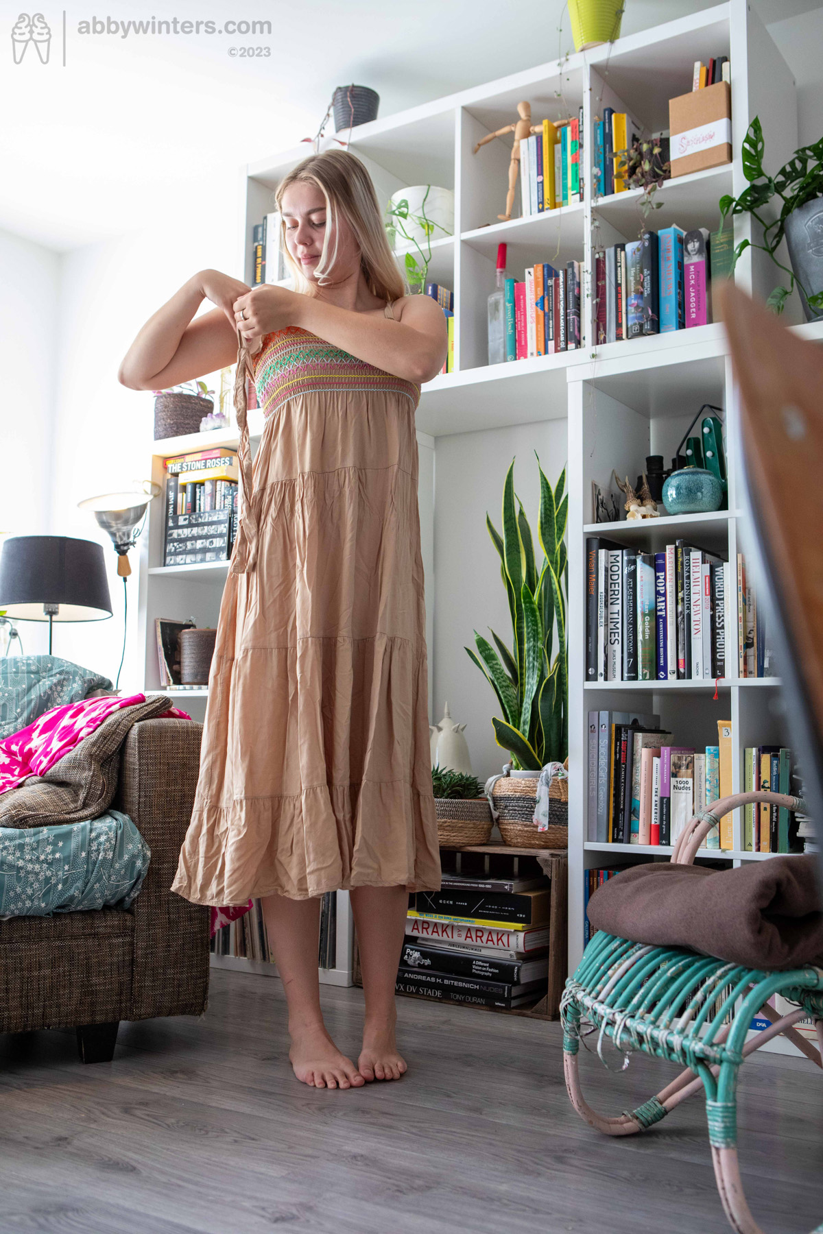 Denise D lets you watch her put on clothes in the dressing room while showing off her natural breasts and shaved pussy on Abby Winters.