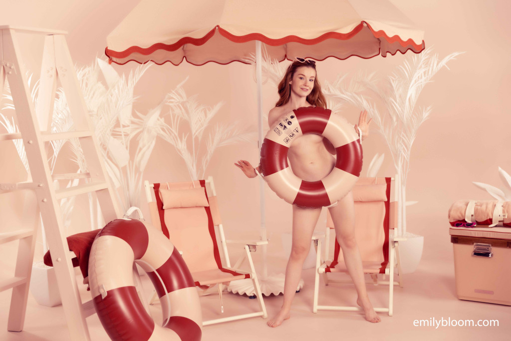 Emily Bloom is having fun on the beach in her pink bikini while she candidly gets naked just for you.