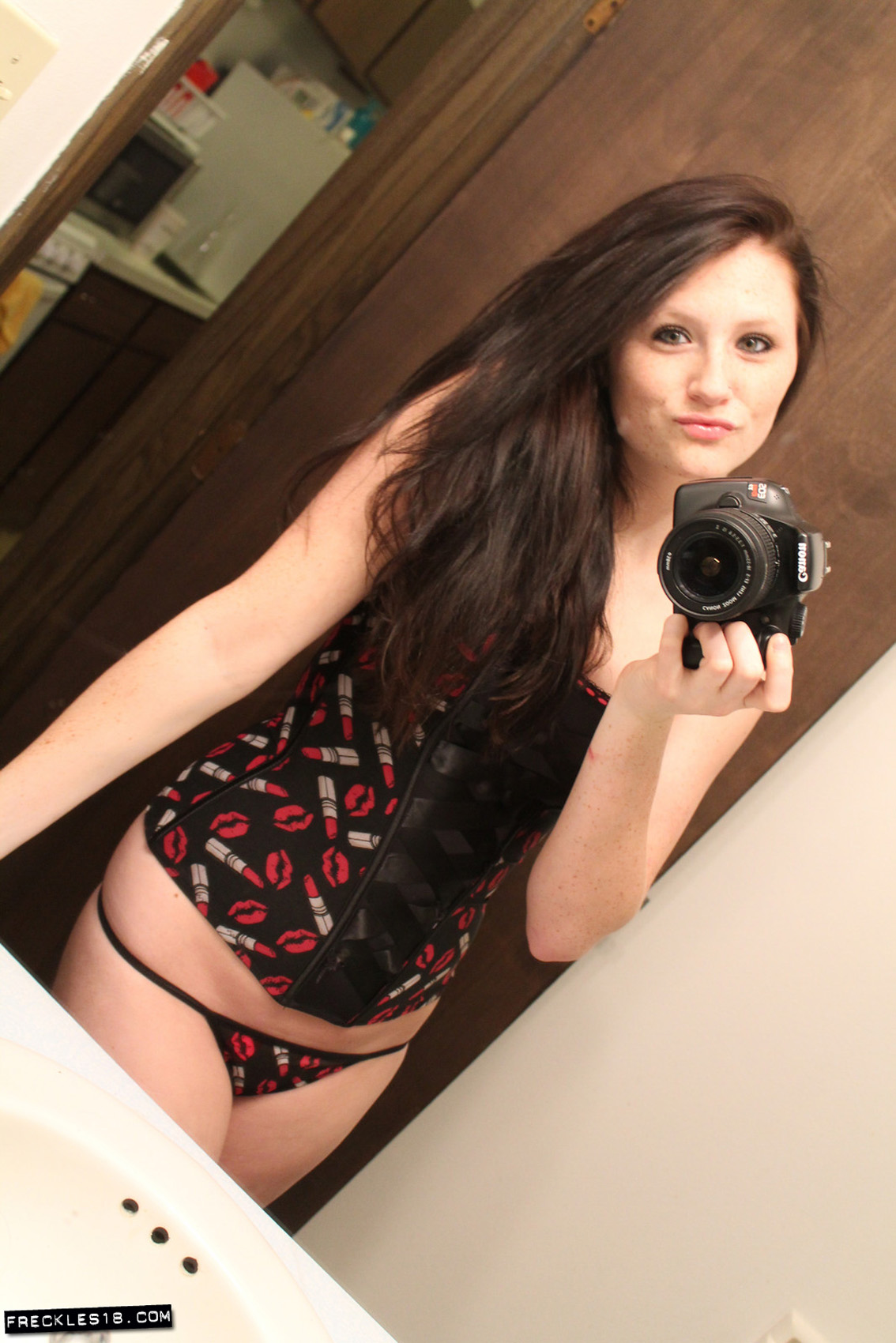 I love how many self shots Freckles 18 takes for us, and I love her new make up corset today. There's a few reasons but the best reason is that corset makes her so revved up, she decides to rip it all off. I love the nipslips too.