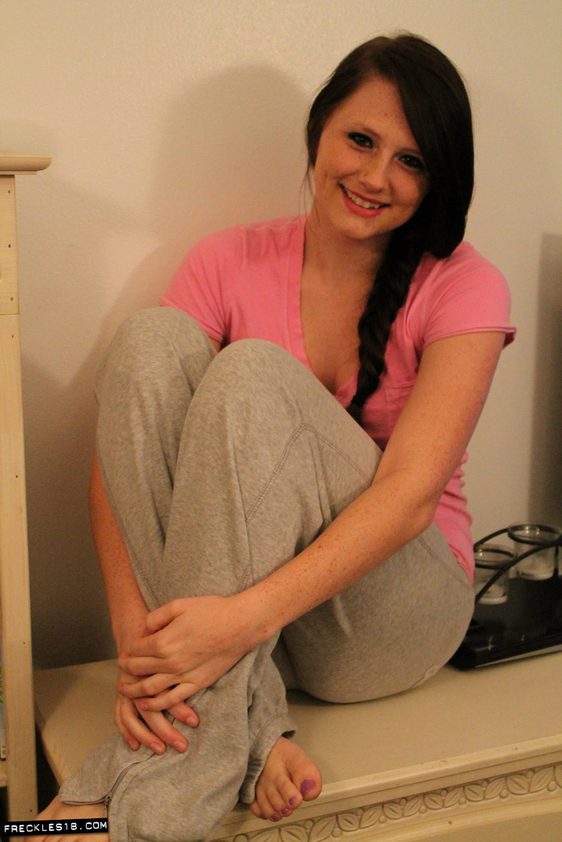 Now this is one slumber party I would love to attend because damn. Freckles 18 ups the anty today by stripping down to her booty shorts, then decides to just get straight up naked at her slumber party. Oh yea, she has a freshly shaved pussy.