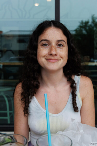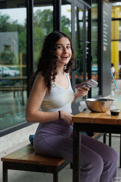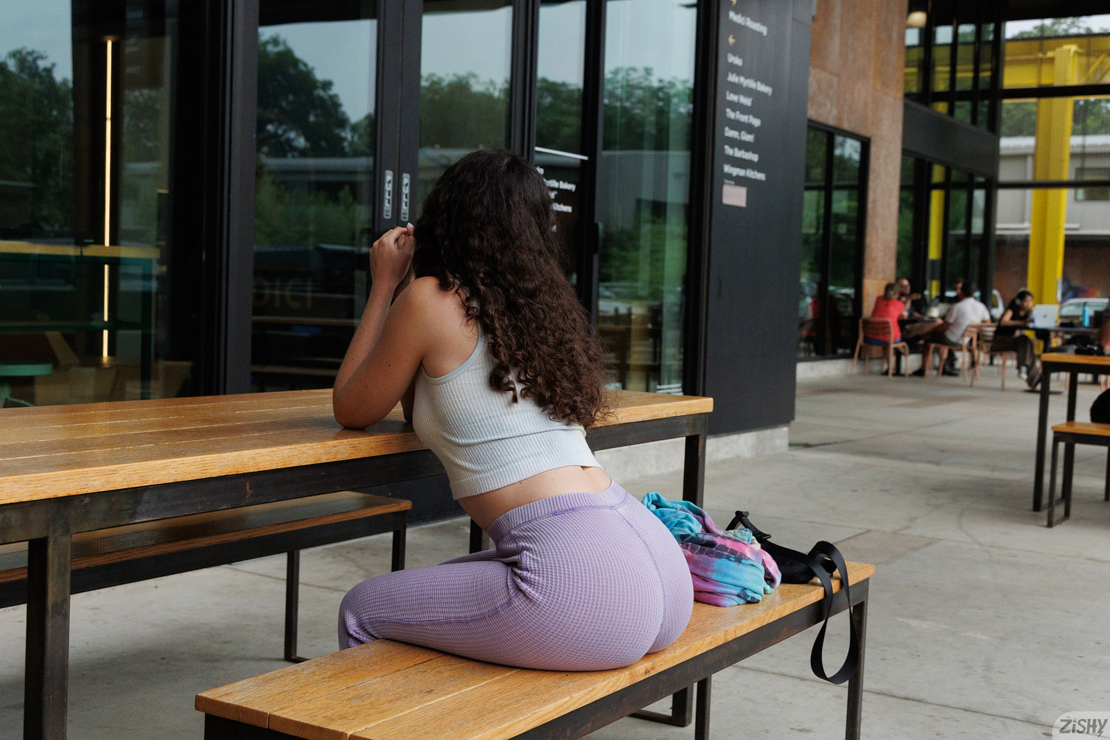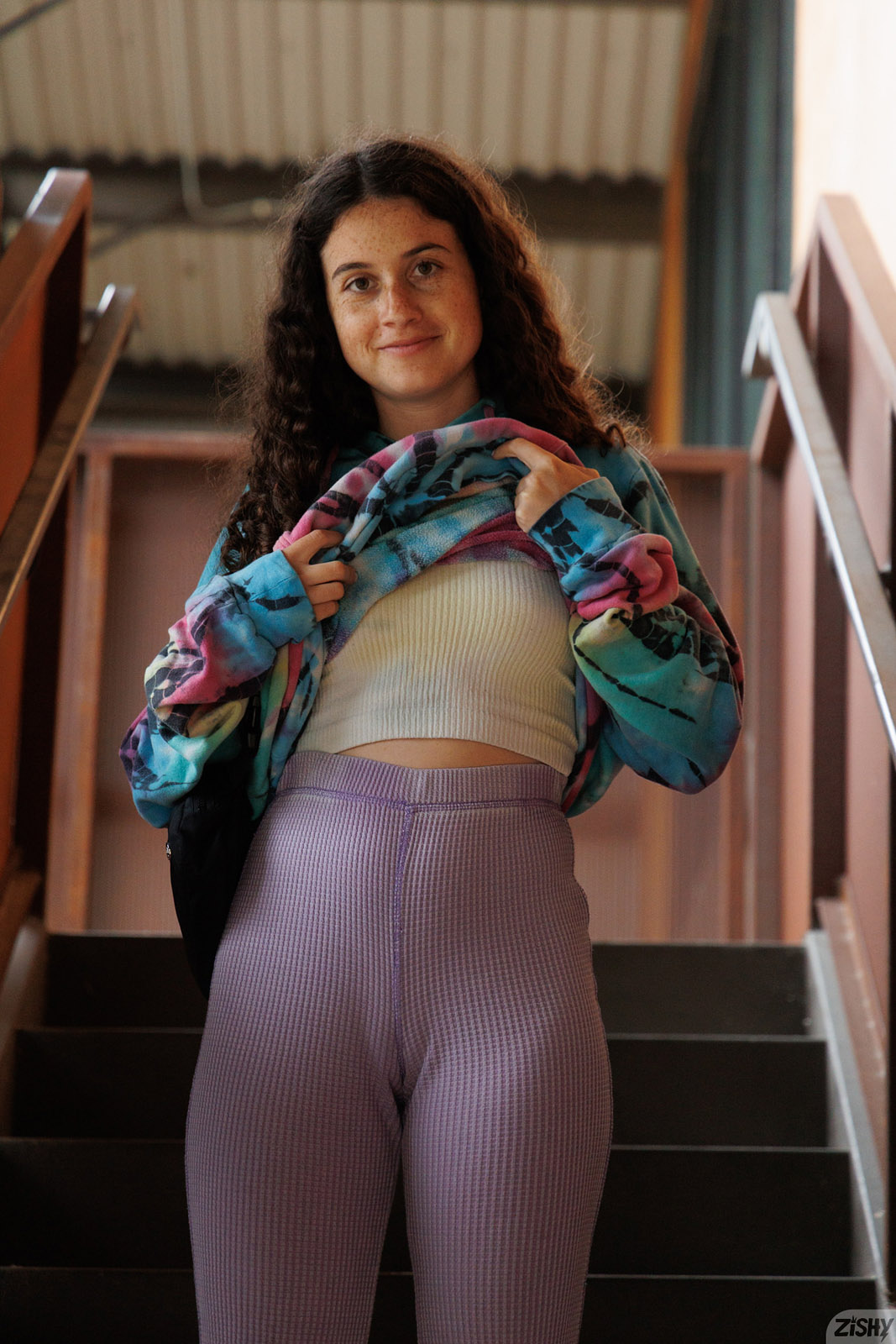 Gabriella Noren loves showing off her purple leggings in public but the real fun starts when she gets wet in her yard on Zishy.