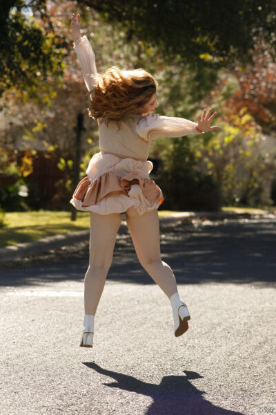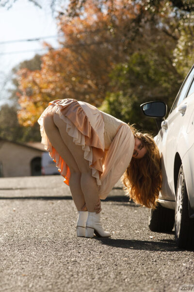 Greta Yarbrough is having a dress sesh where she's twirling around outside and revealing her hairy pussy in public only on Zishy.