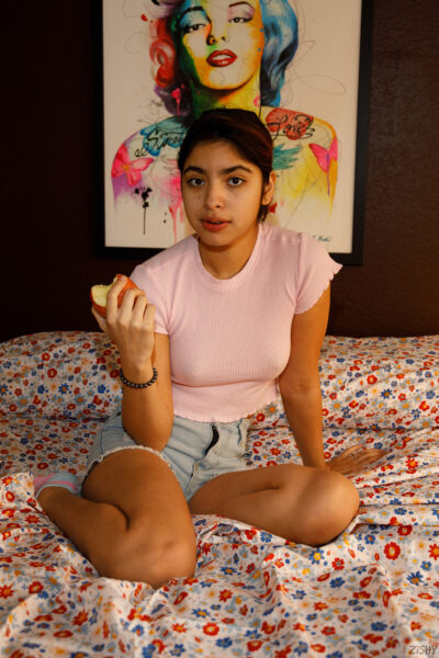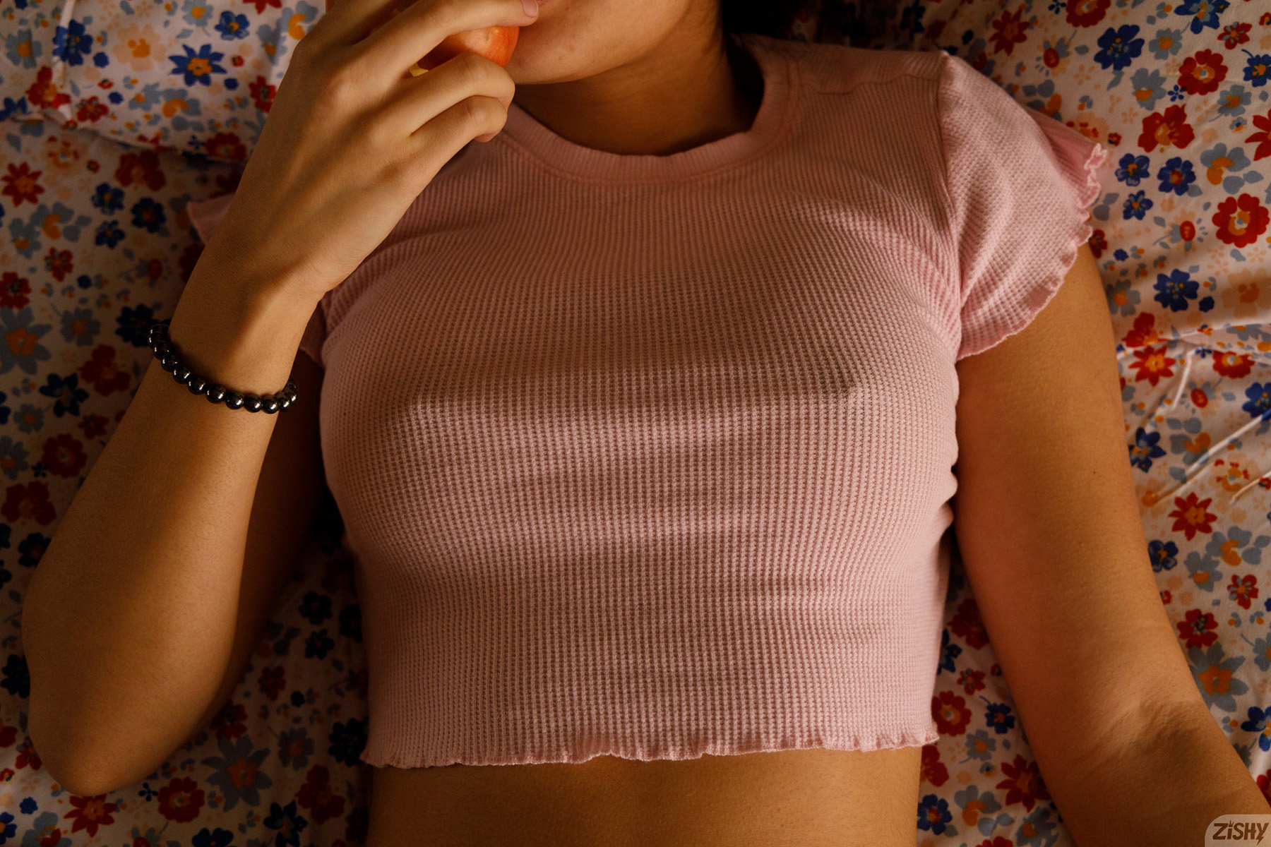 Hazel Heart is all about them apples because she goes apple picking before taking off her tank top to have fun in bed on Zishy.