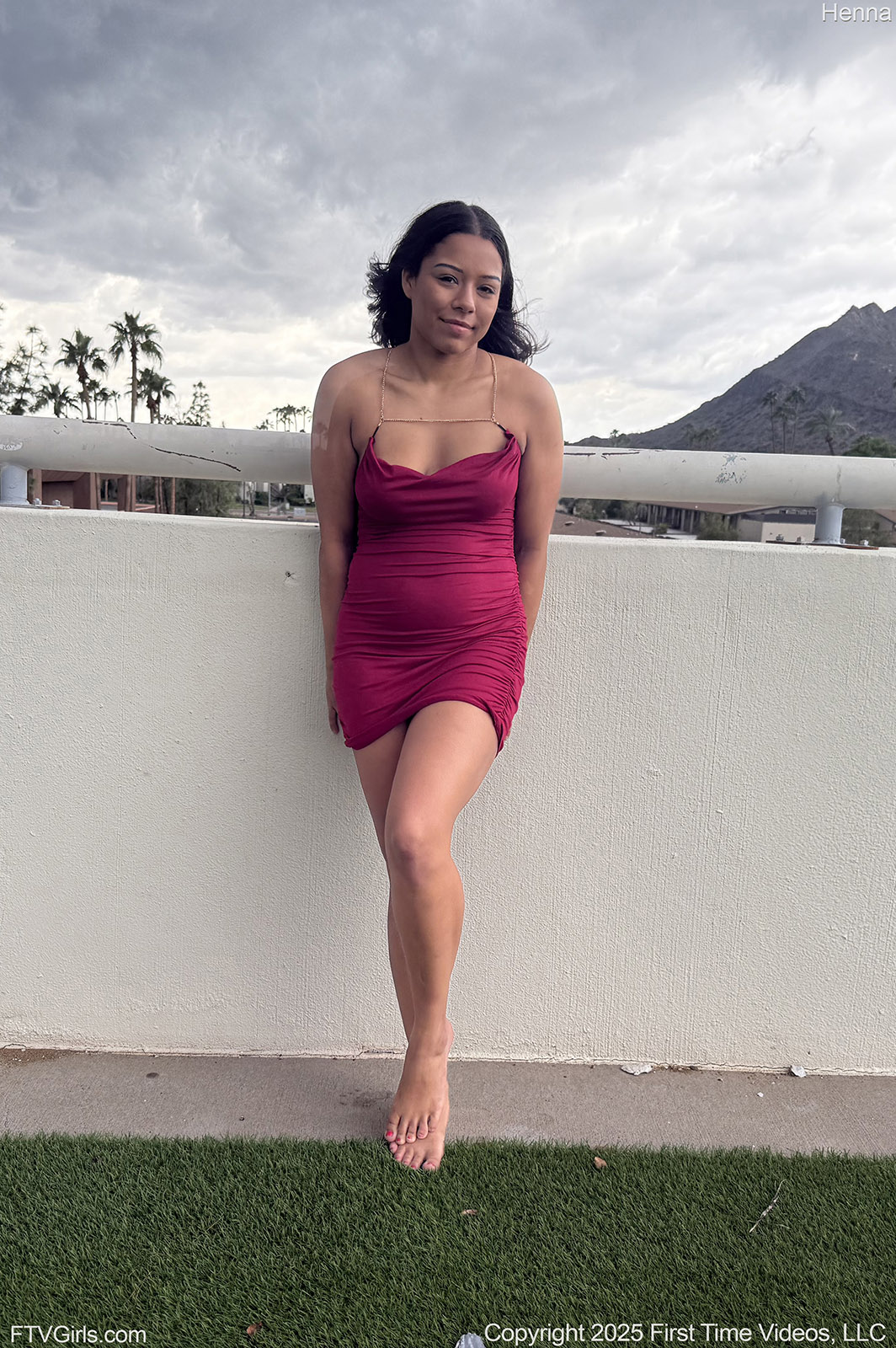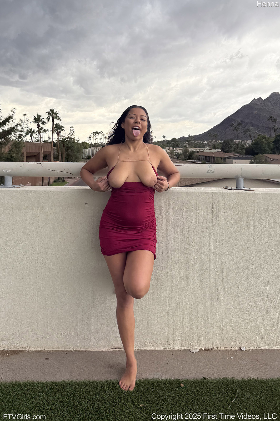Henna Vale feels the storm brewing behind her which is why she takes off her red dress to flash her big boobs and butt on FTV Girls.
