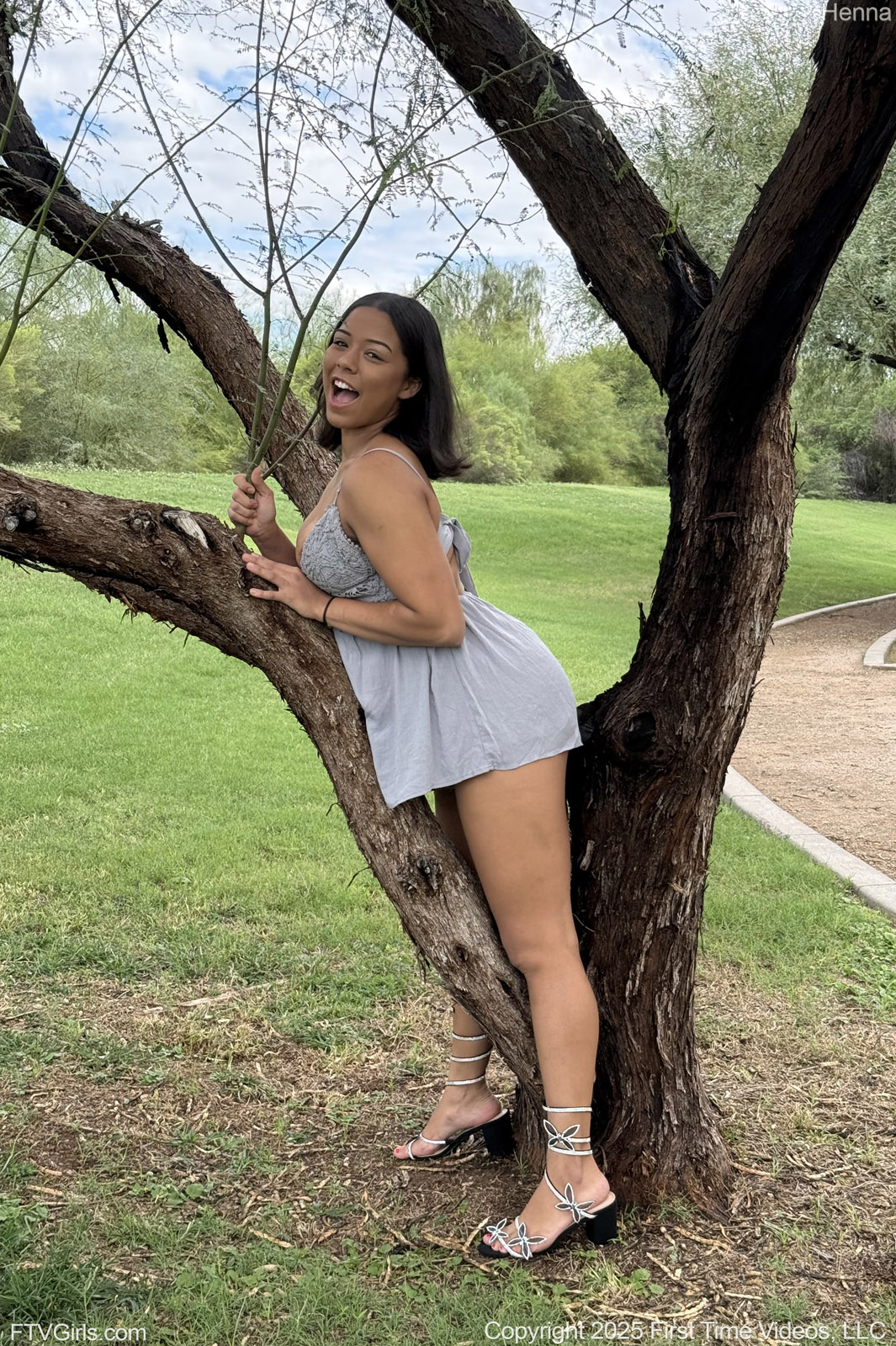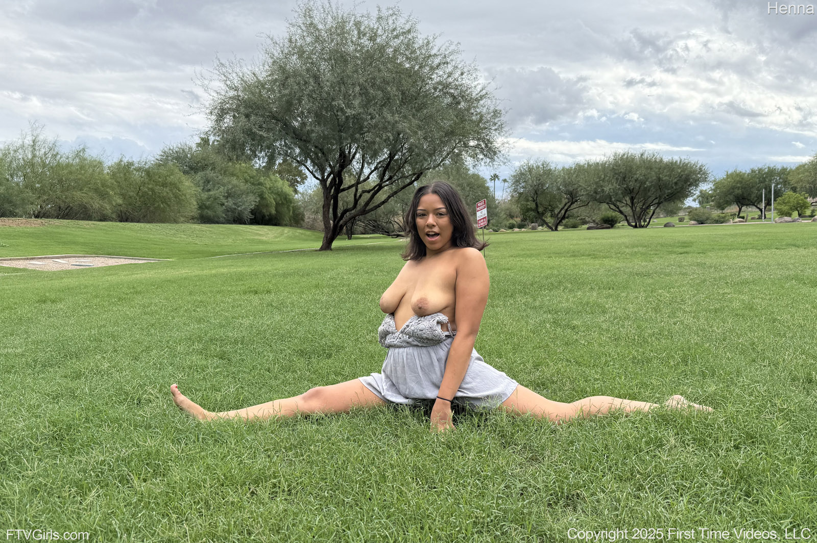 Henna Vale takes off her romper at the golf course and just literally walks around naked with her big boobs exposed on FTV Girls.