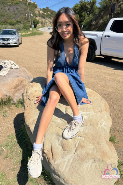 Jade Kimiko is the cute asian girl in the denim blue dress and big glasses who wants to flash her very tight pussy on ATK Girlfriends.