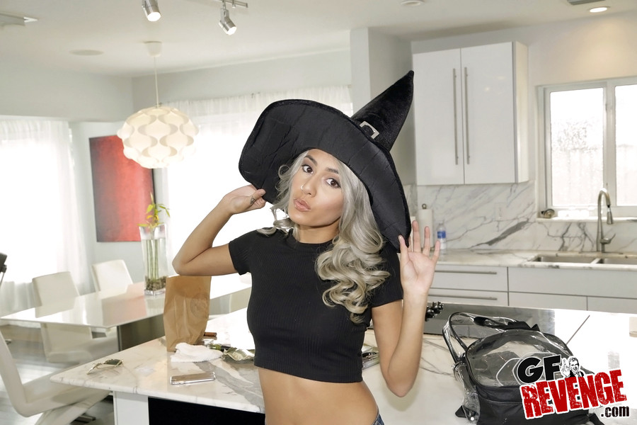 Janice from GF Revenge was playing around with a costume today when she got the idea to play a sexy witch. This turns out quite sexy as Janice ends up naked, showing off her neatly trimmed bush and perky tits that defy gravity. Can you say perfect?