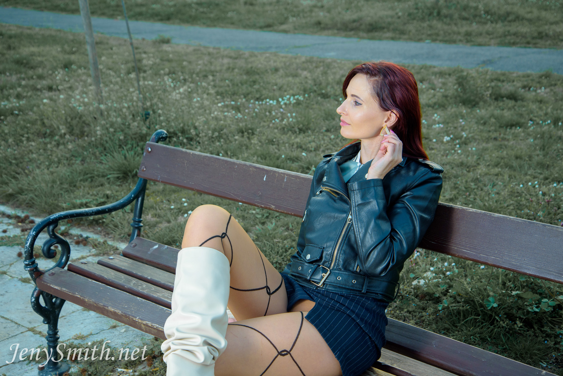 Jeny Smith is so excited to wear her pantyhose with prints that she goes outside in a mini skirt to flash her pussy!