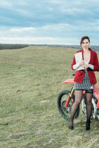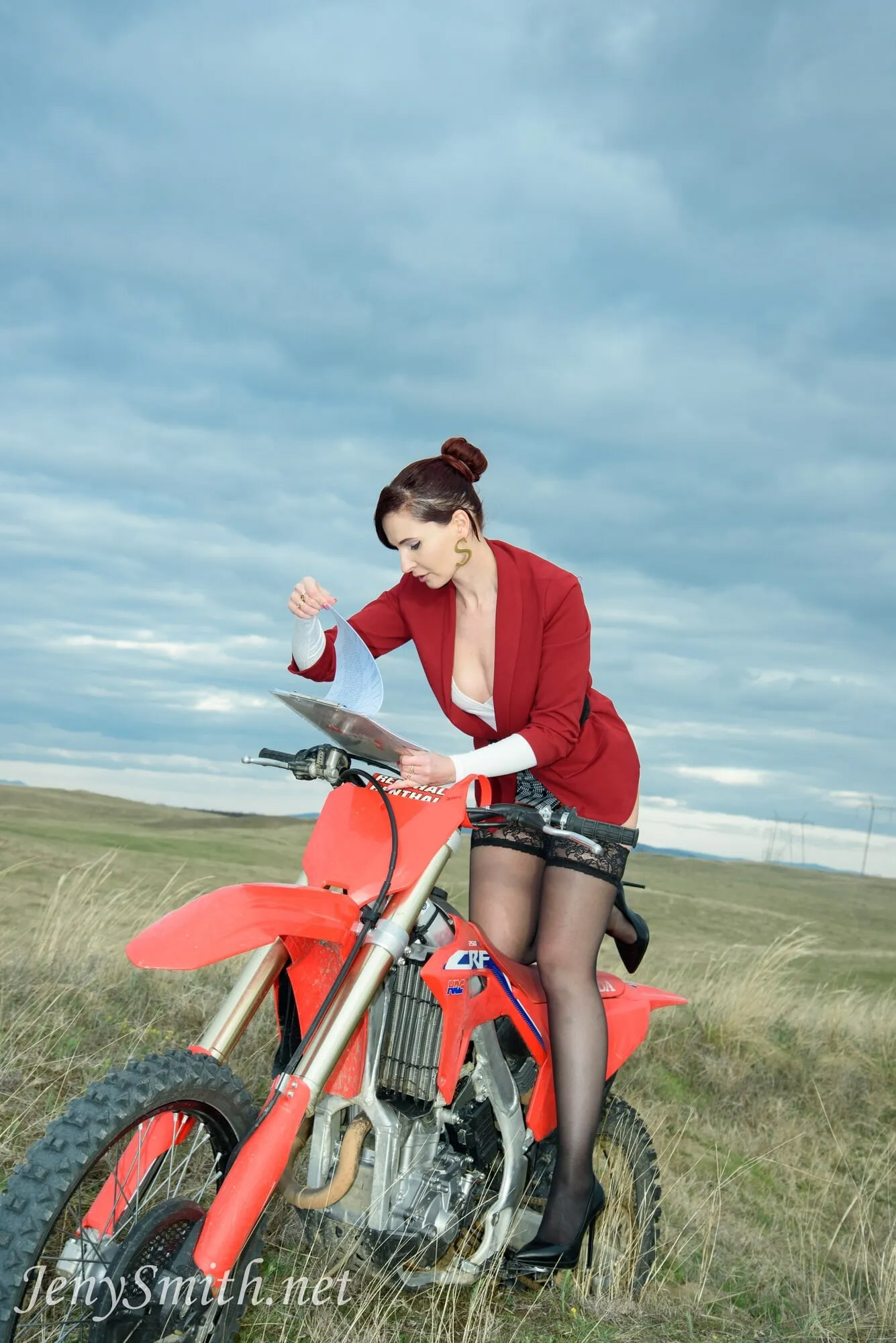 Jeny Smith is riding her motor bike in a blouse and skirt when there's an unexpected finding. She has to sign papers and ends up doing it half naked outside.