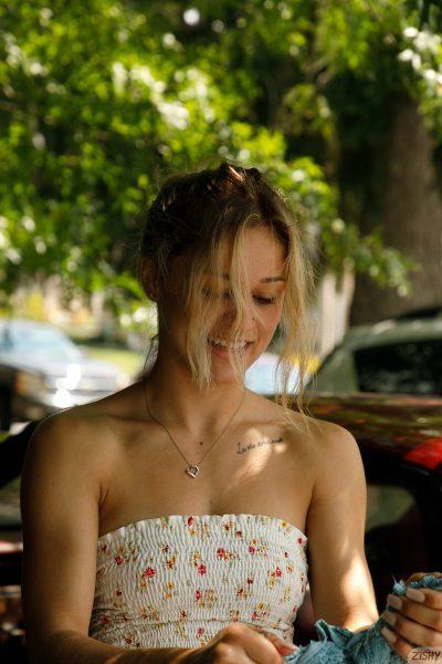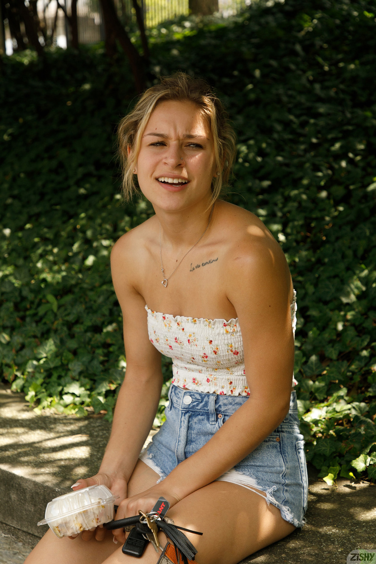 Jezebel Madd is cleaning out her car in a cute tube top and shorts while she accidentally flashes her boobs and ass on Zishy for the set Only In America 1.