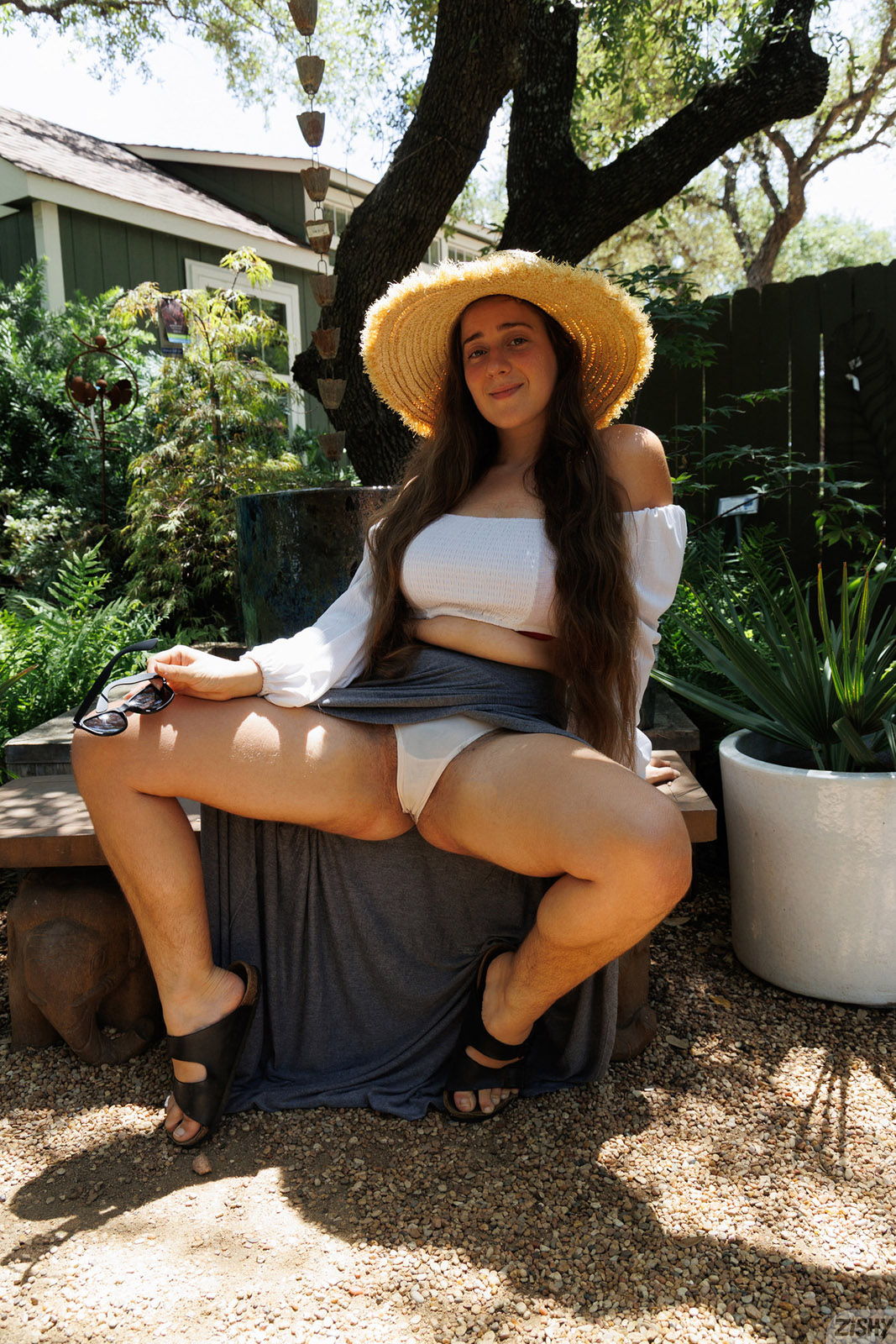 Josie Beall is that curvy girl next door who enjoys flashing her huge boobs and hairy pussy in the flower section while posing for Zishy.