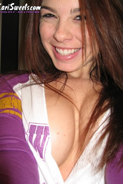 , she's way more frisky! Take a look at this gallery, we see Kari in her room sporting some pretty tiny panties and before you know it, she is flashing her shaved pussy.