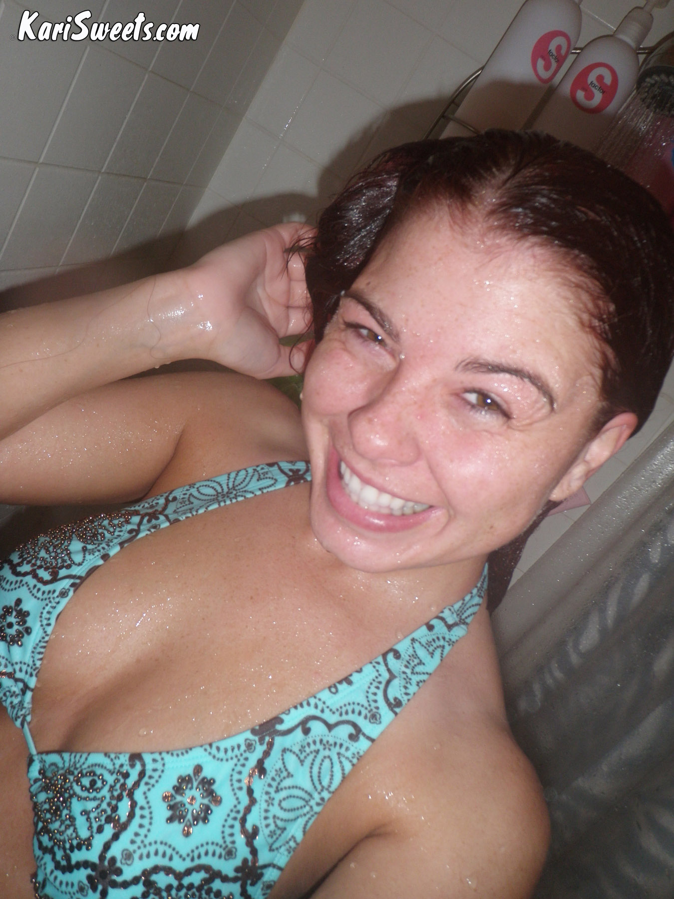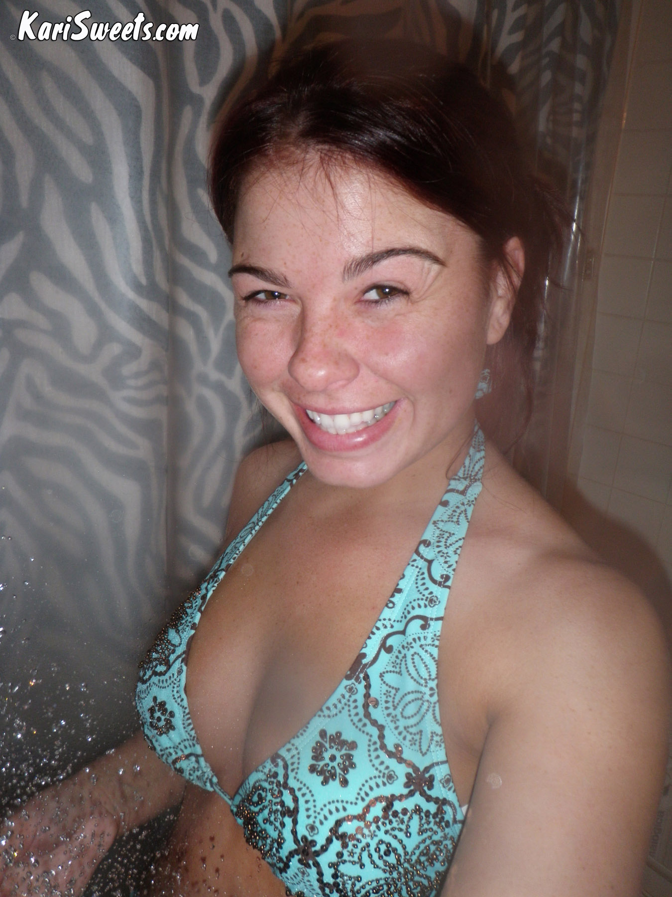 Close your eyes and think of the best shower scene, now open them and take a look at Kari Sweets getting soaking wet in the shower. The bikini is a formality because Kari soon gets naked and shows off more skin than she planned on.