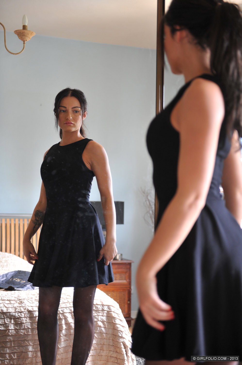 and watch her pick out something good. Then let's go home with her, watch her get naked and put on the sexiest tight black dress ever. This date is getting good.