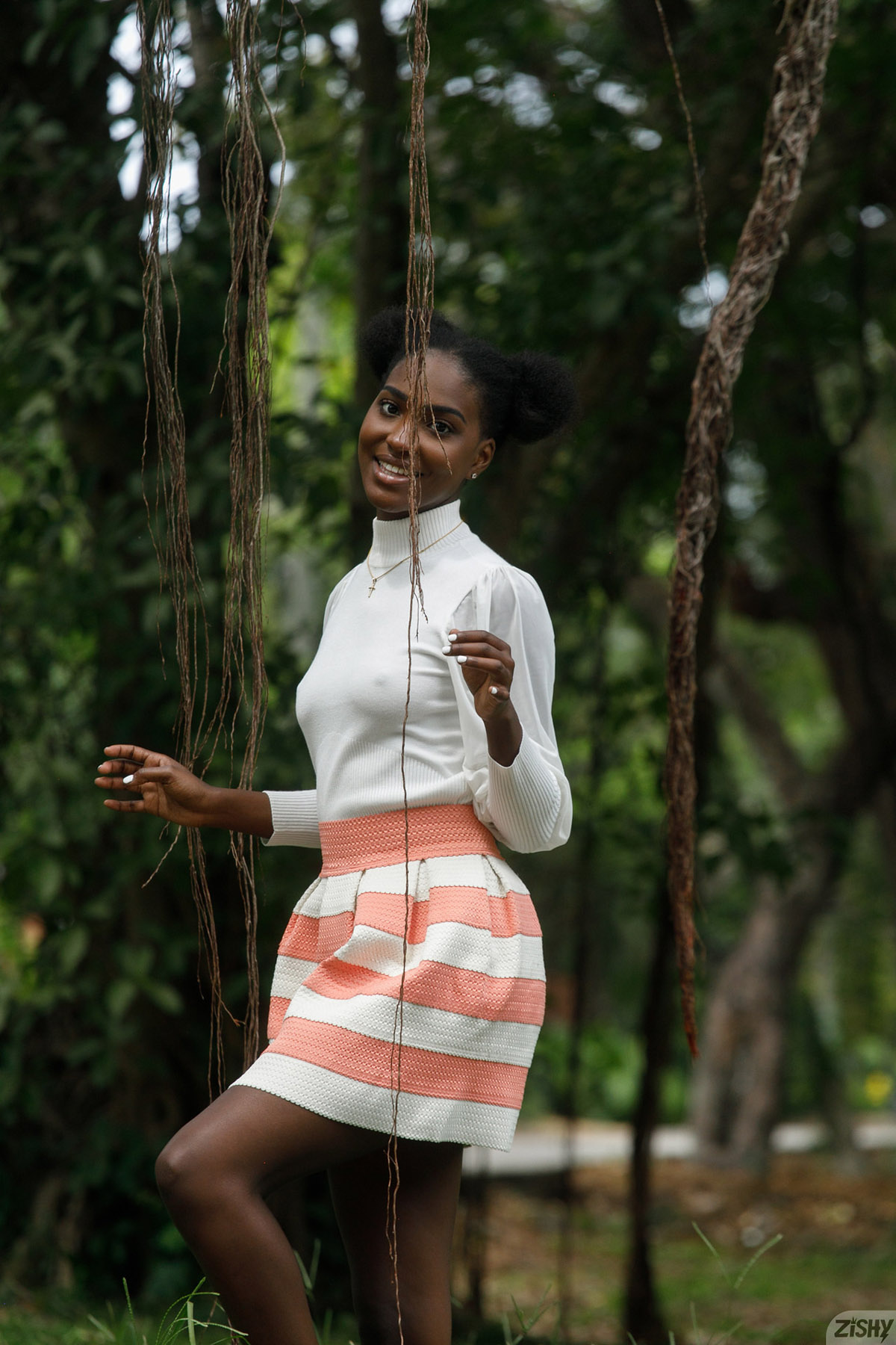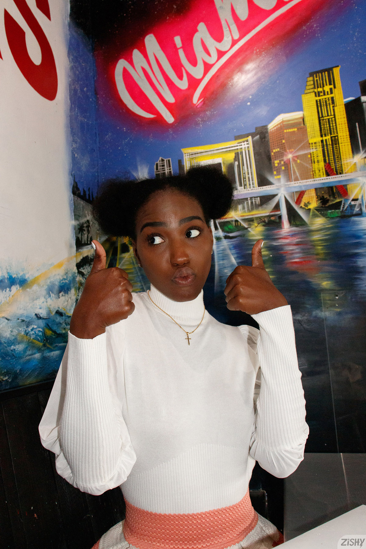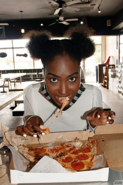 Kelsey Jones loves eating miami pies (pizza) before she flashes her ass around town and then hops in the shower on Zishy. It's ok to play voyeur to a hot black babe as the water drips down her ass.