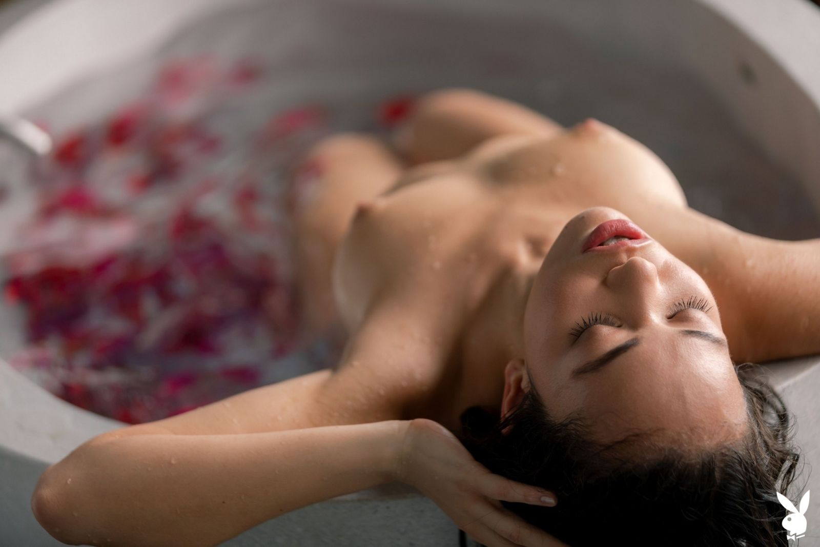 Kit Rysha likes the calm waters of a good bath where she has roses waiting for her silky smooth body to touch on Playboy.