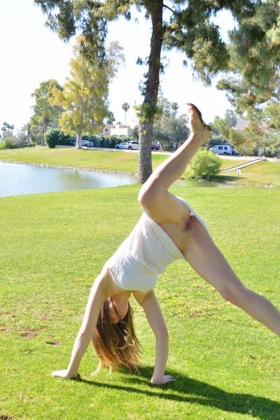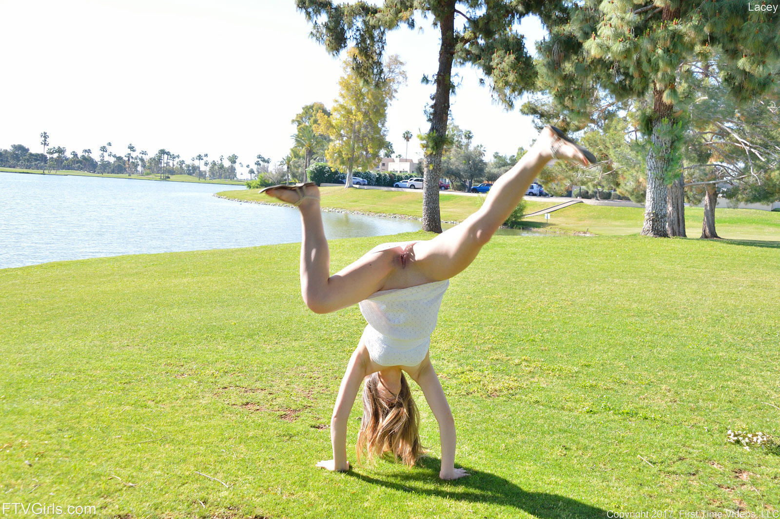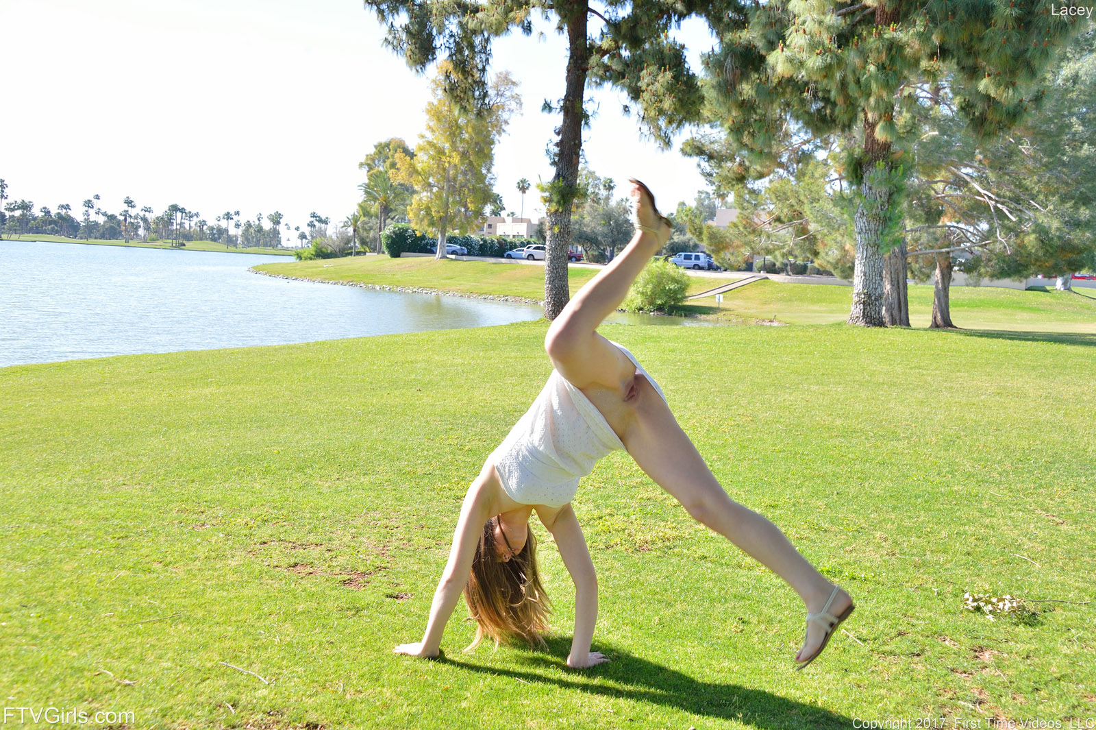 Some girls go to the lake to have a relaxing day. Others go to the lake to do cartwheels in a mini dress without any panties. That girl is newcomer Lacey, and she's going to make a big splash on