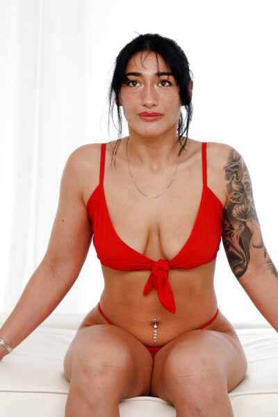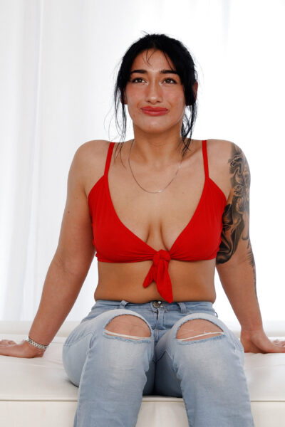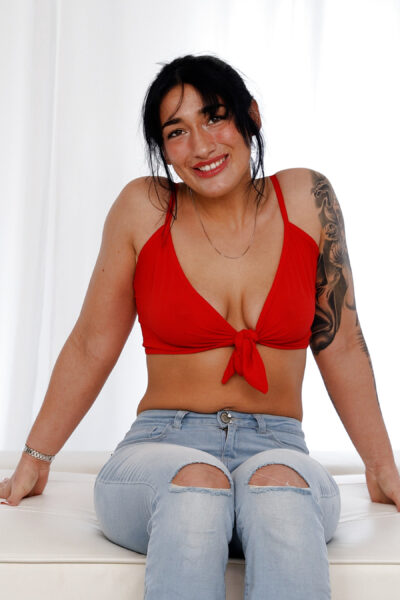 Lana Diez is back in a sexy red top and jeans because this slim thick beauty is ready to experience ecstasy on Casting Couch HD.