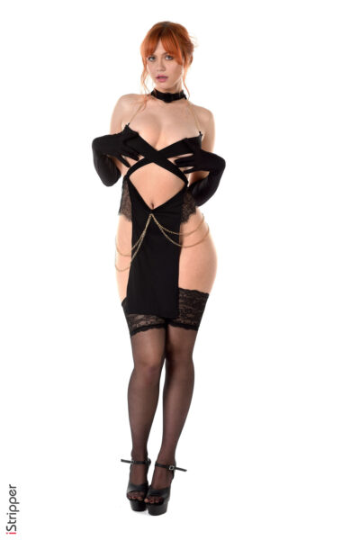 Lana Lane wears a sophisticated dress that is made for some sort of ballroom event but instead it's a naked event for IStripper.