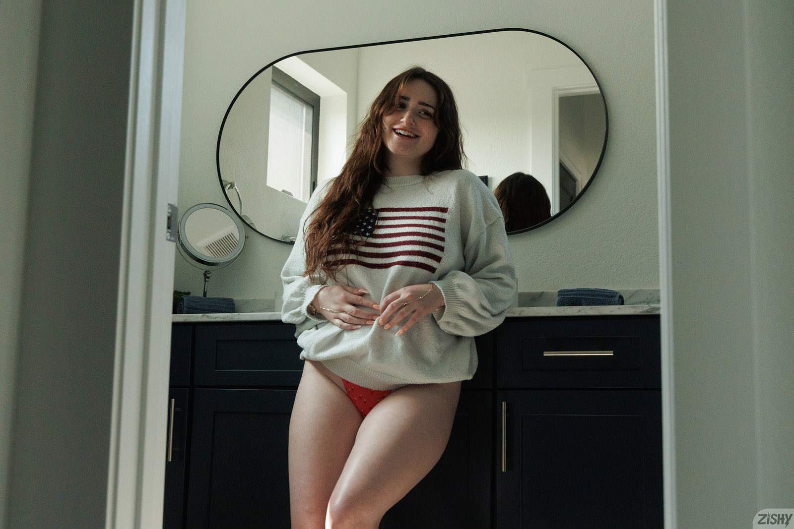 Lilibet Saunders likes to try on different outfits like a little dress or maybe a sexy hoodie and thong combo while showing off her curves on Zishy.