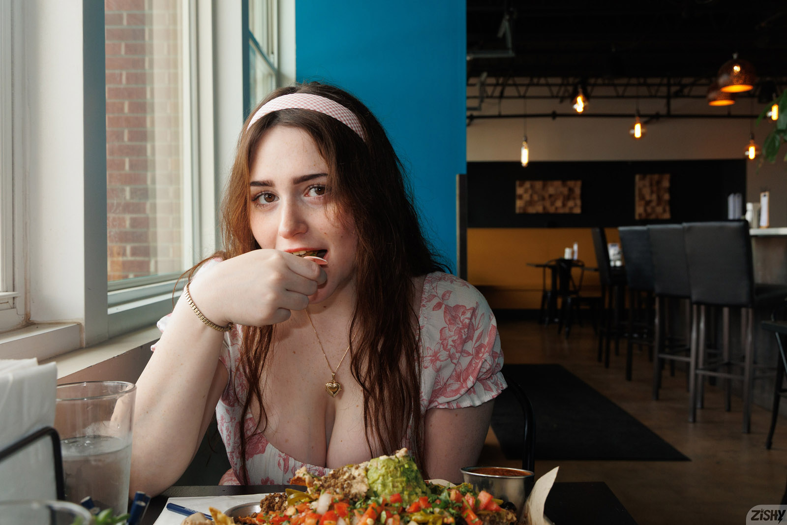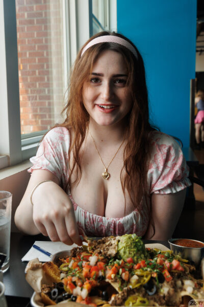 Lilibet Saunders loves eating tacos in her low cut dress while she flashes her big bouncy boobs as the best lunch partner on Zishy.