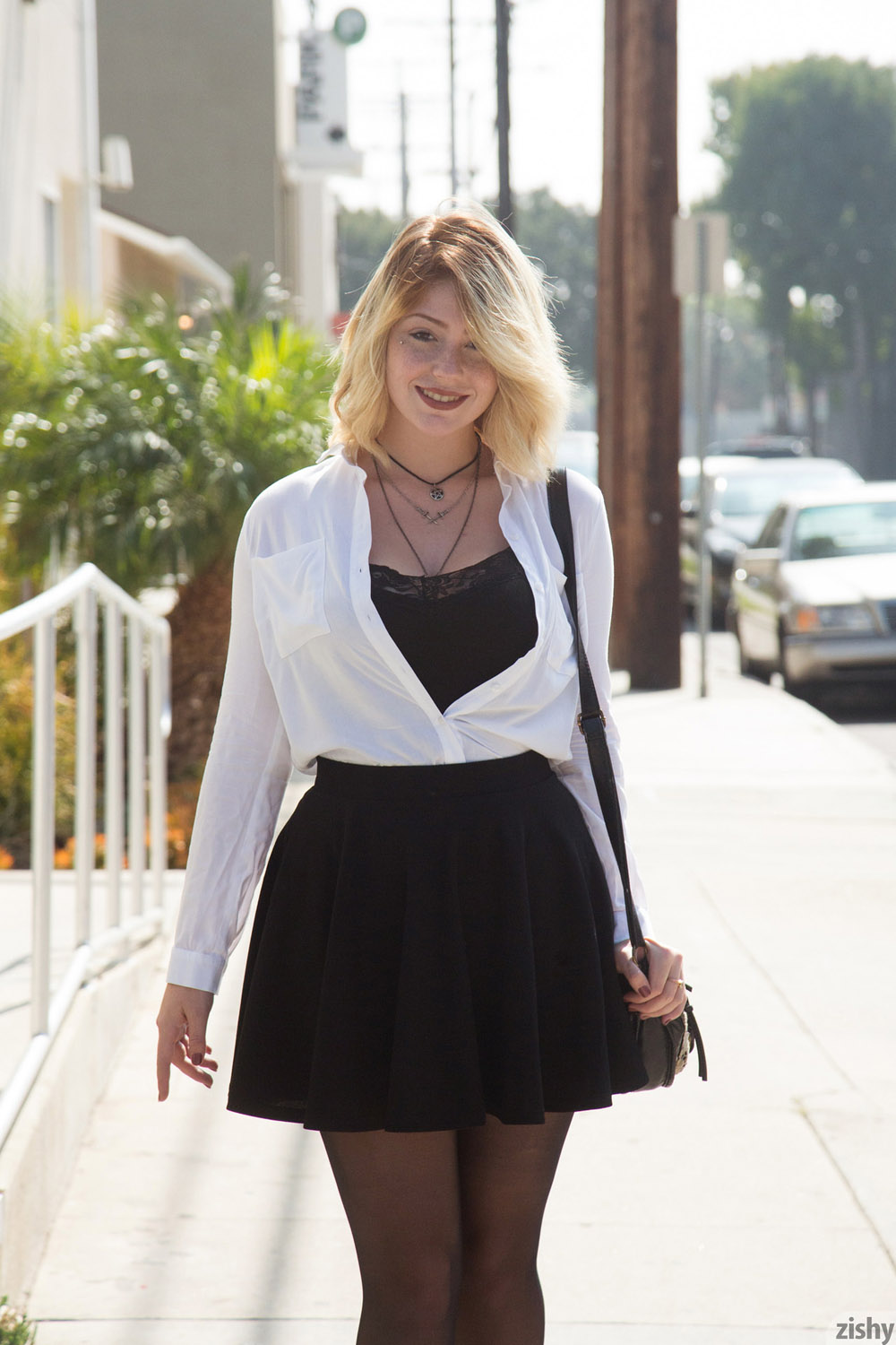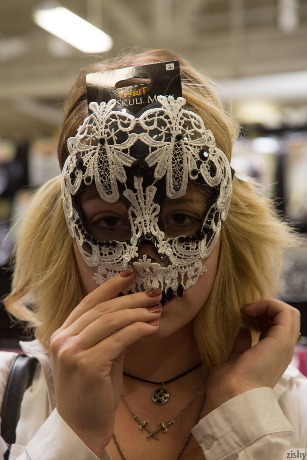 I had a dream about a cute girl in a costume store last night, and then I went on Zishy today and my dream came true. Madison Sage is not only cute as hell but she's the girl who tries on outfits in the middle of the store, lifts up her skirt and reveals a very creamy wet pussy.