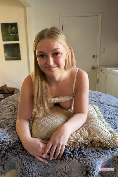 McKenzie Mae is the perfect blonde girl next door to show off her nice tits and ass after removing her skirt on ATK Girlfriends.