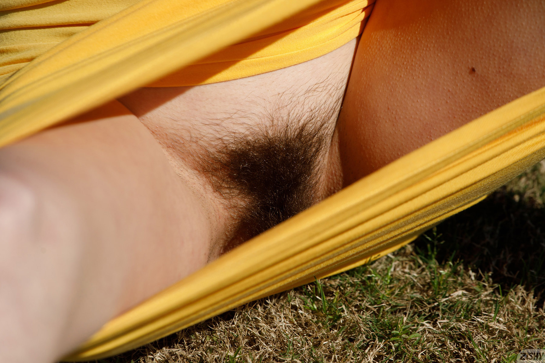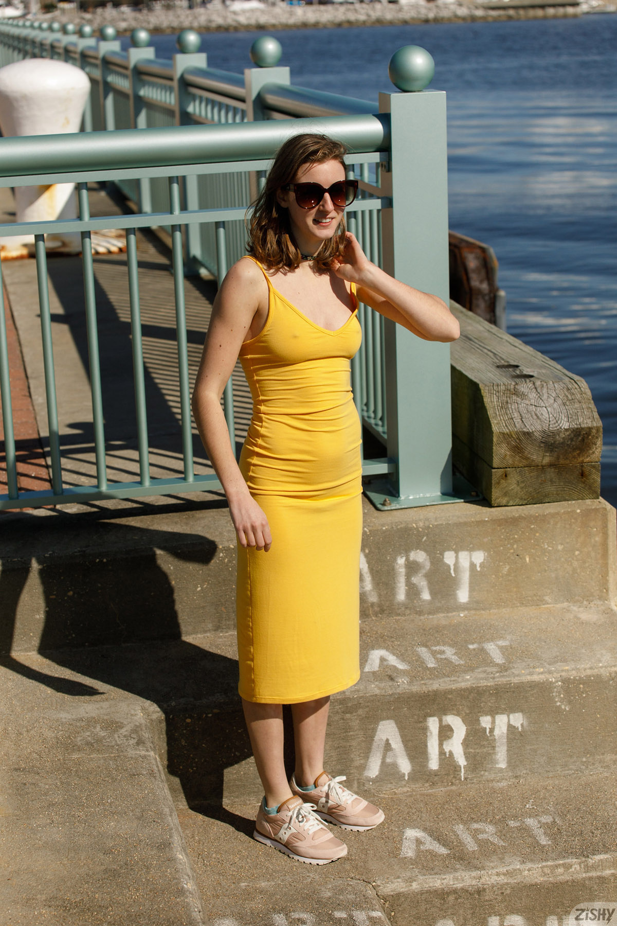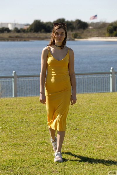 Meadow Brink is the perfect version of an American Honeysuckle in her cute little yellow dress flashing her hairy pussy on Zishy. Meadow even does some fun stuff outside like parkour on a railing.