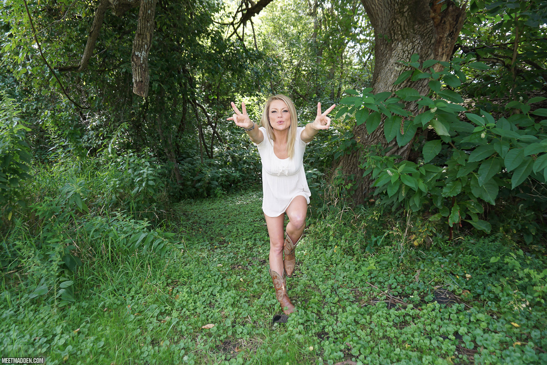 Meet Madden likes to have a romp in her White Sundress and tiny purple thong, while she actually flashes her boobs outside.