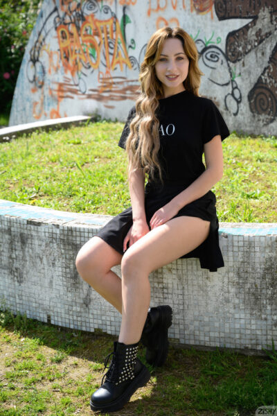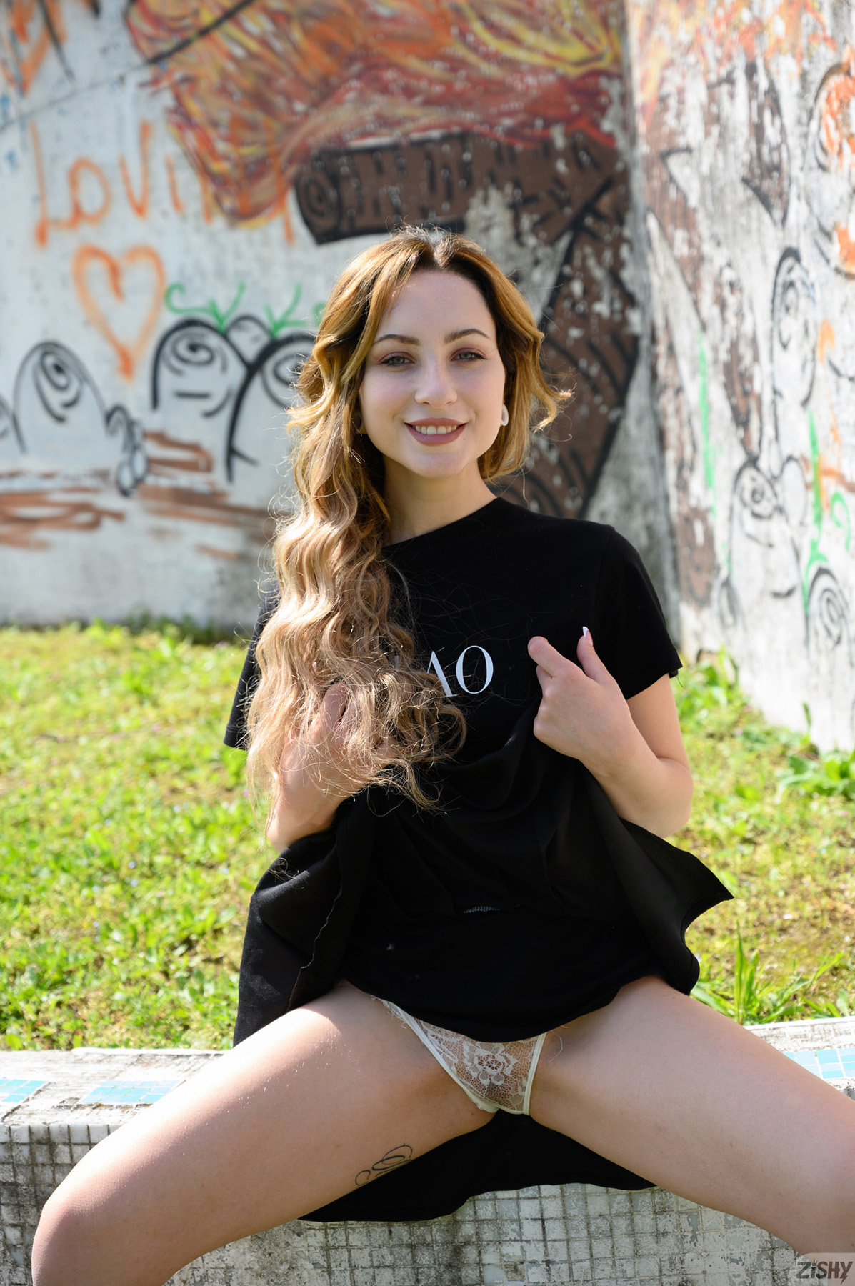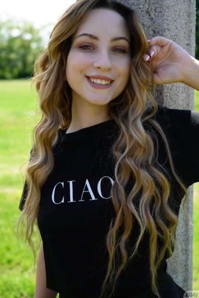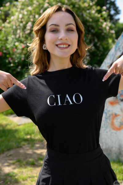 Meleida Tosca says Ciao as she takes off her black shirt and skirt to reveal her perfect naked body in the shower as she poses nude on Zishy.