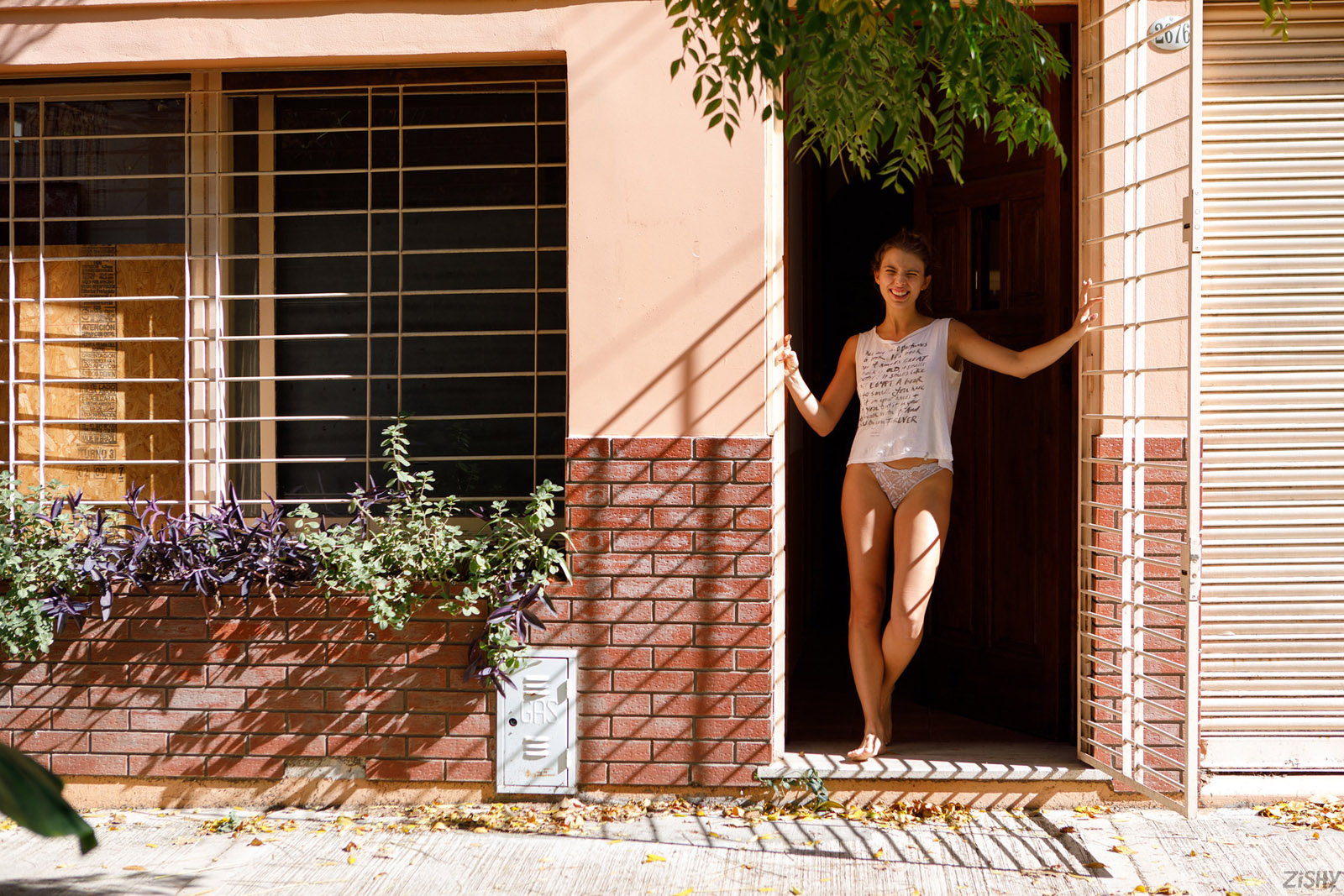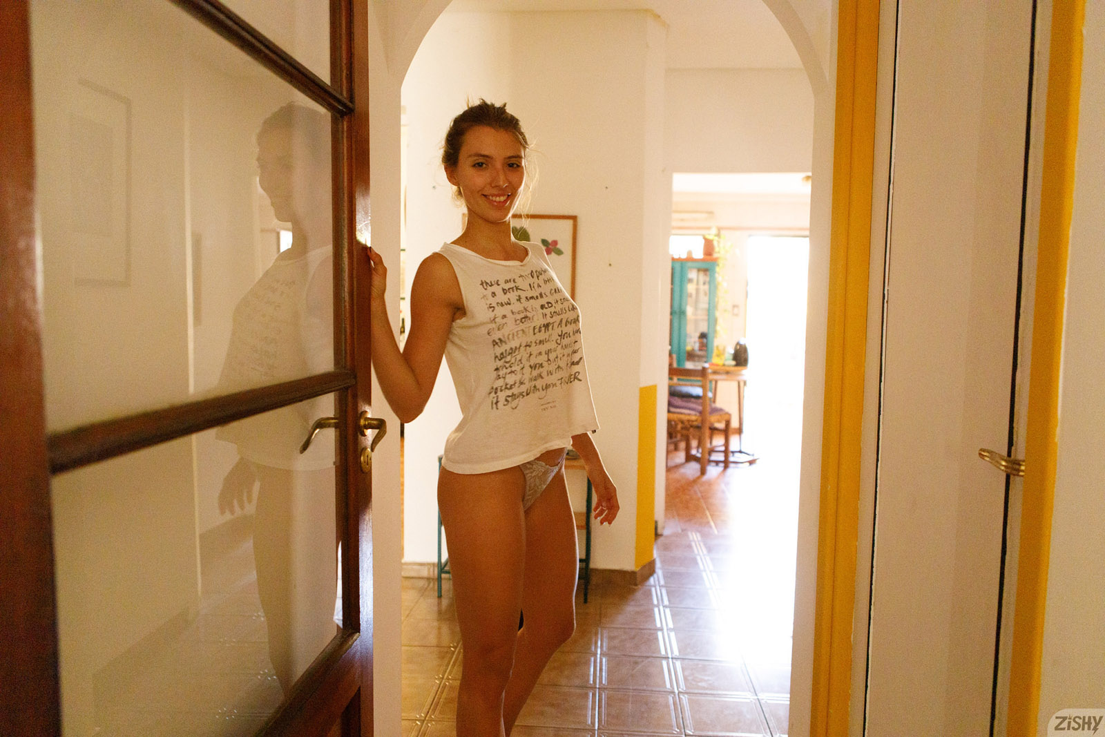 Melina Amaru has an alt breakfast in her t-shirt and thong while you get to see her amazing perky tits and ass on Zishy.