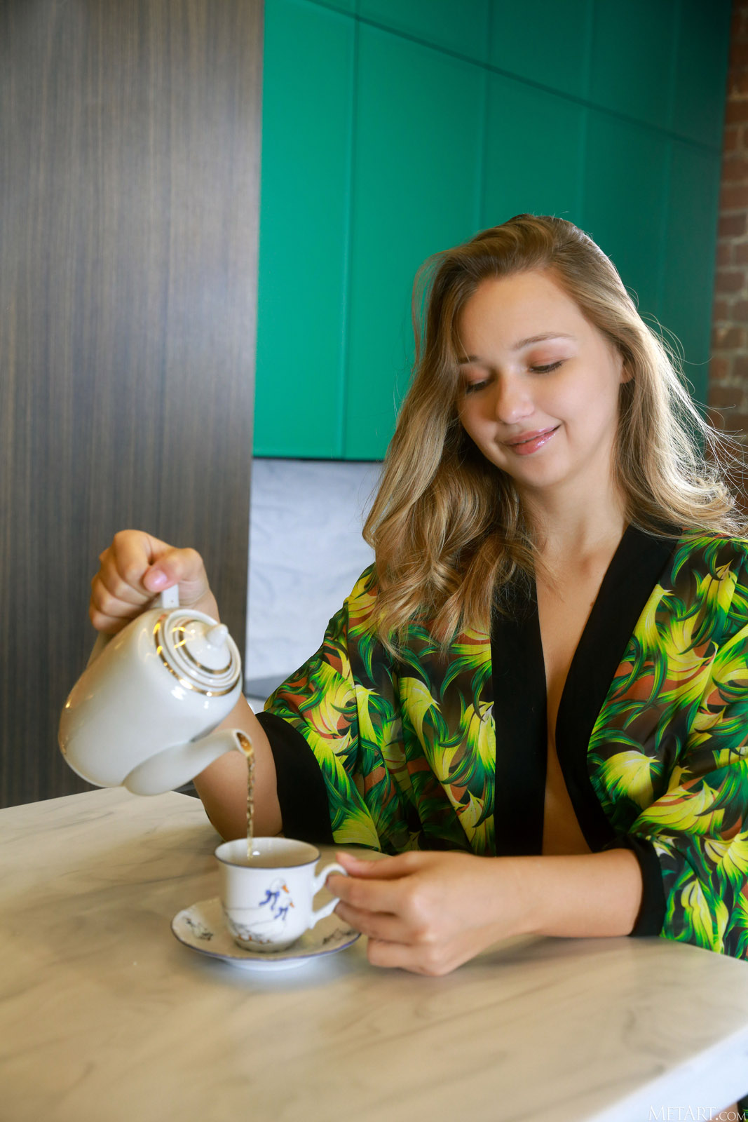 Mila Ex has a flamboyant style as she pours a cup of tea and takes off her robe for a naked morning session on Met Art.