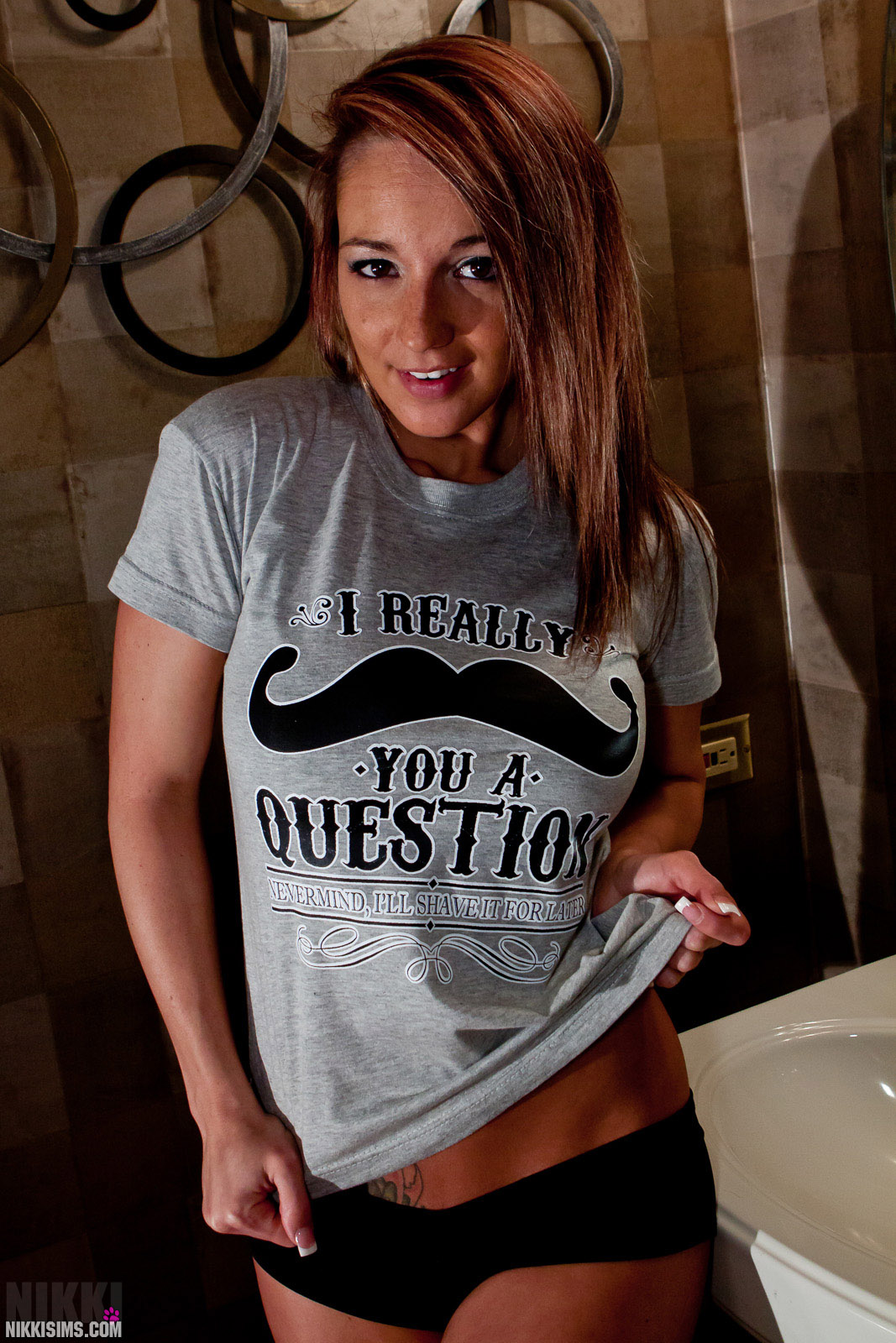 We get to see the goofy side of Nikki Sims today where she is sporting a fake moustache, and another type of body hair. Here's a hint, look at the last few pictures showing her landing strip and pussy lips. Yea, you read that right. ;)