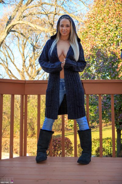 It's one of those nice autumn days where Nikki Sims can walk around topless, wearing her overcoat and jeans. I love how good her boobs looks, considering that her hair is draped over them and eventually we get a nice long view of her hard nipples. What? She's excited!