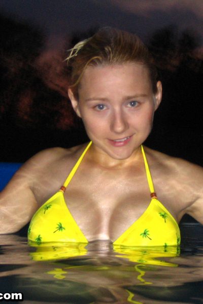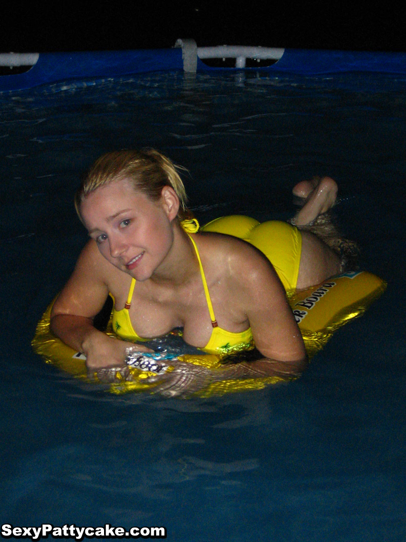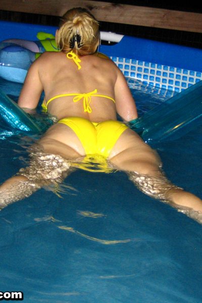 A warm summer night usually leads to one thing: skinnydipping. Pattycake has that on her mind when she dips in the pool really late wearing her tiny yellow bikini. One thing I love about Pattycake is her ass always looks good in a bikini.
