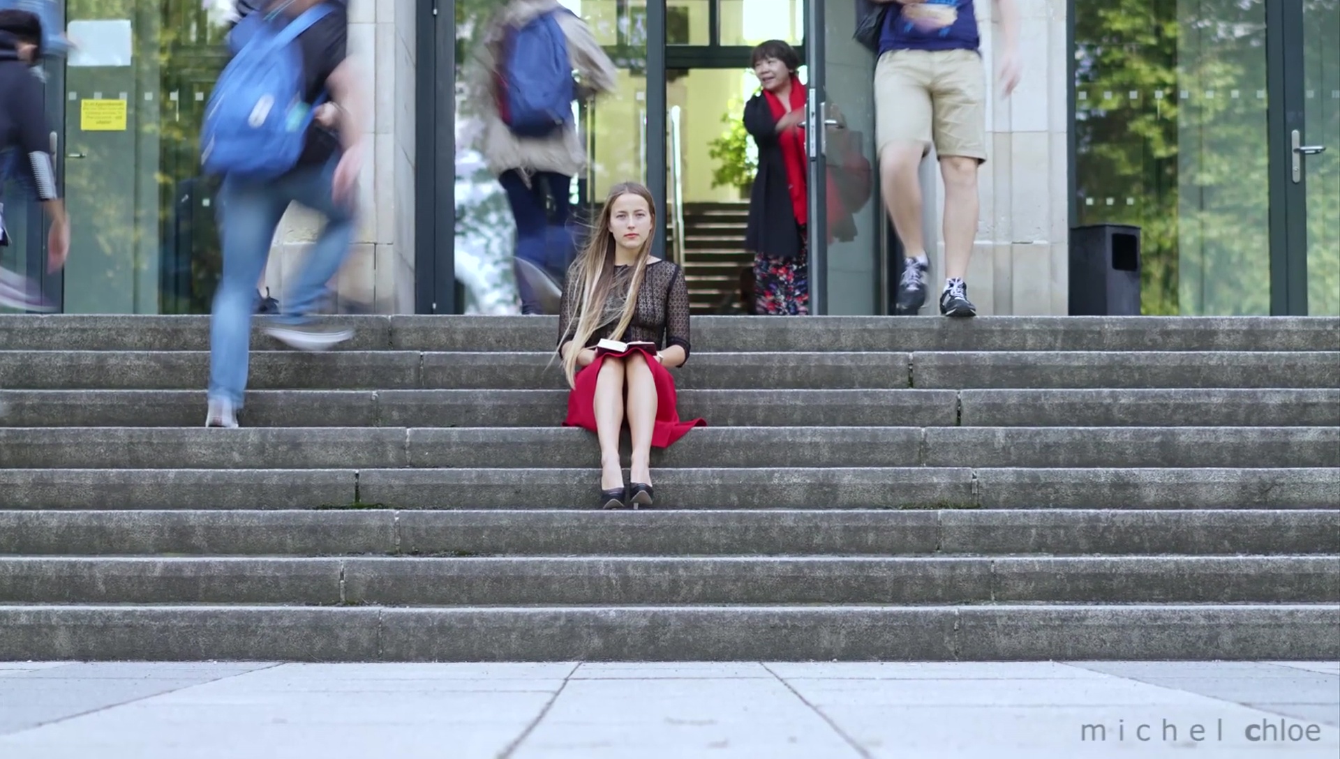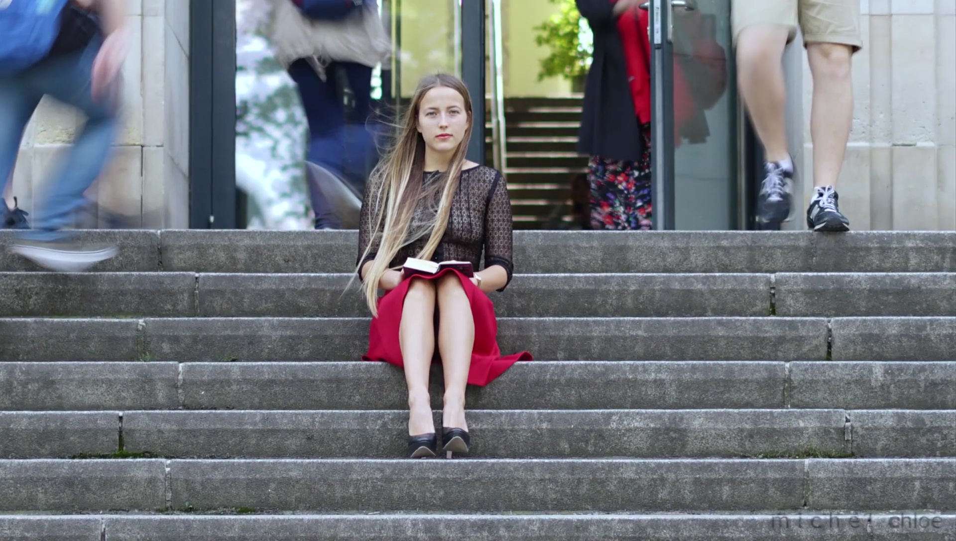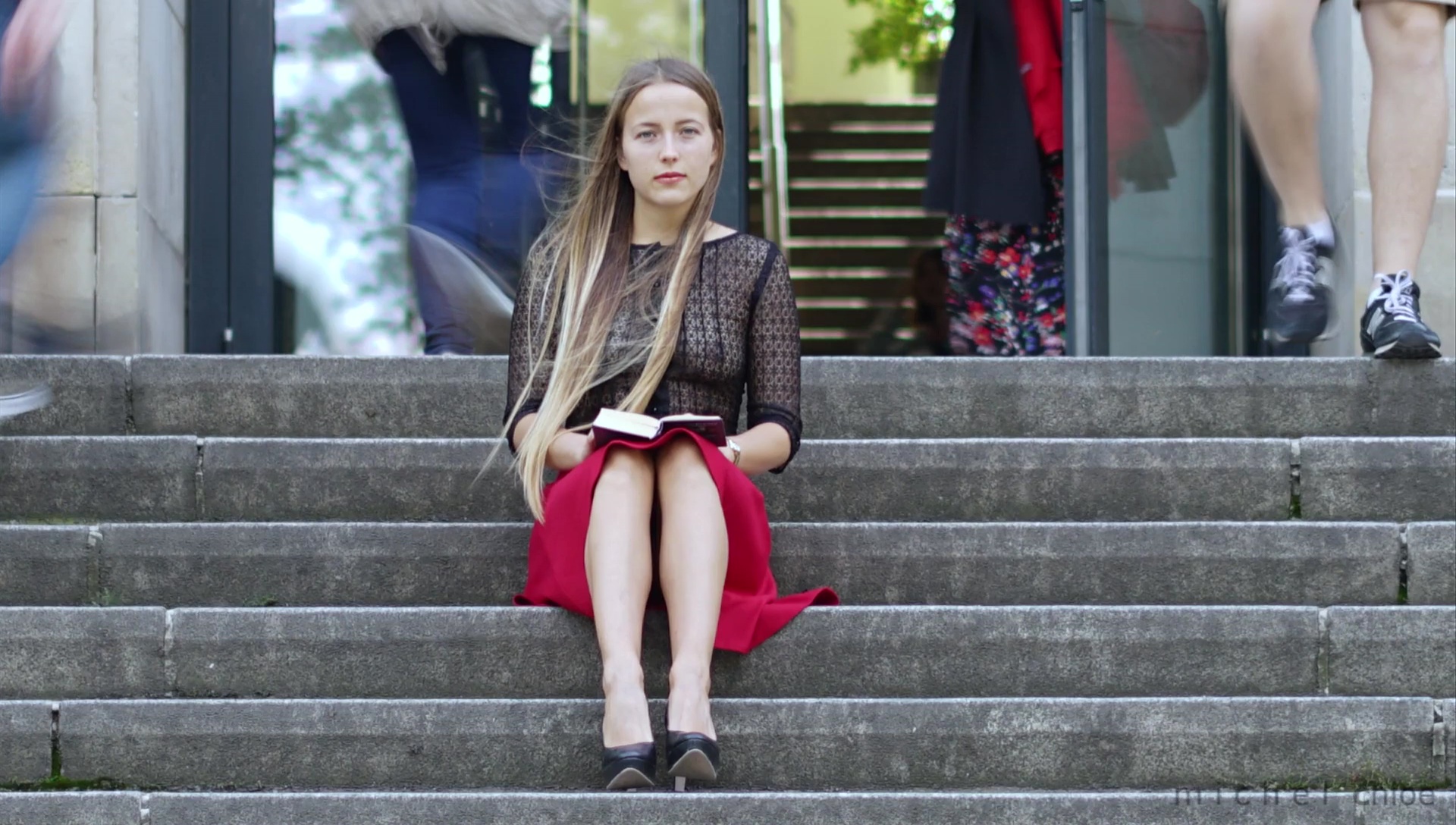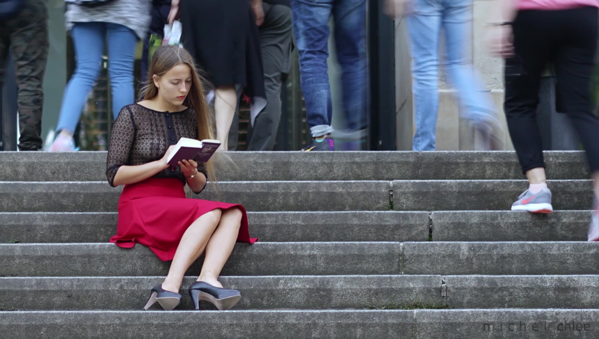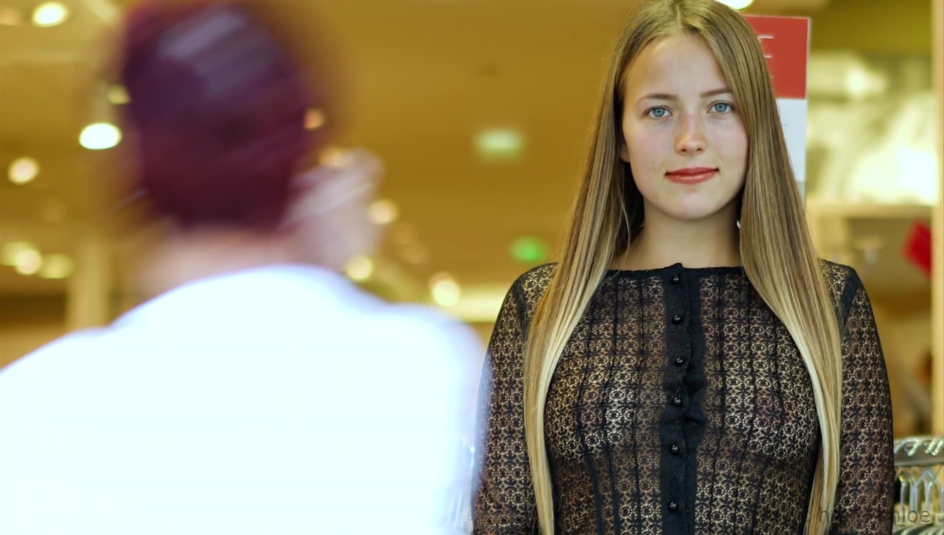 Paul Eluard is the theme of a sexy blonde girl wearing a completely see thru top in public while people stare at her on Michels World.